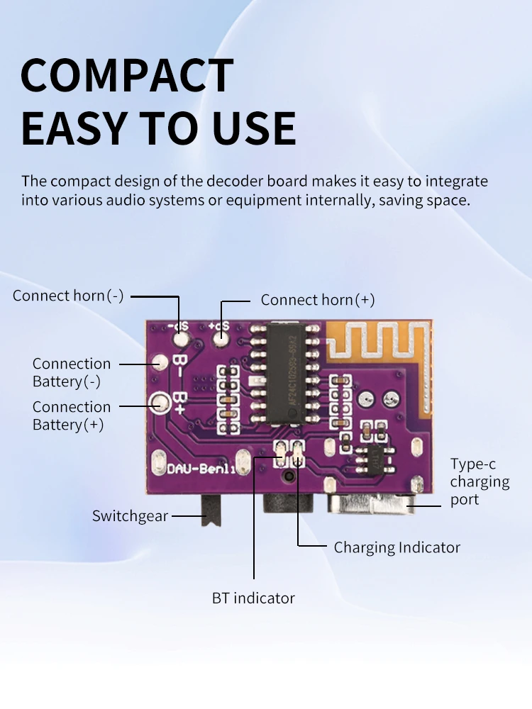 After receiving the Bluetooth board, solder the speaker and 3.7V lithium battery according to the wiring diagram below, and then check that the battery is not reversed before starting the test. Turn on the switch and the blue indicator light should be on. If it is not on, quickly shut down and check if the battery is installed correctly. When the indicator light is on and there is a beeping sound, you can turn on your phone's Bluetooth and refresh the Bluetooth name. Find "DAU Audio" to connect and play your phone's music.
