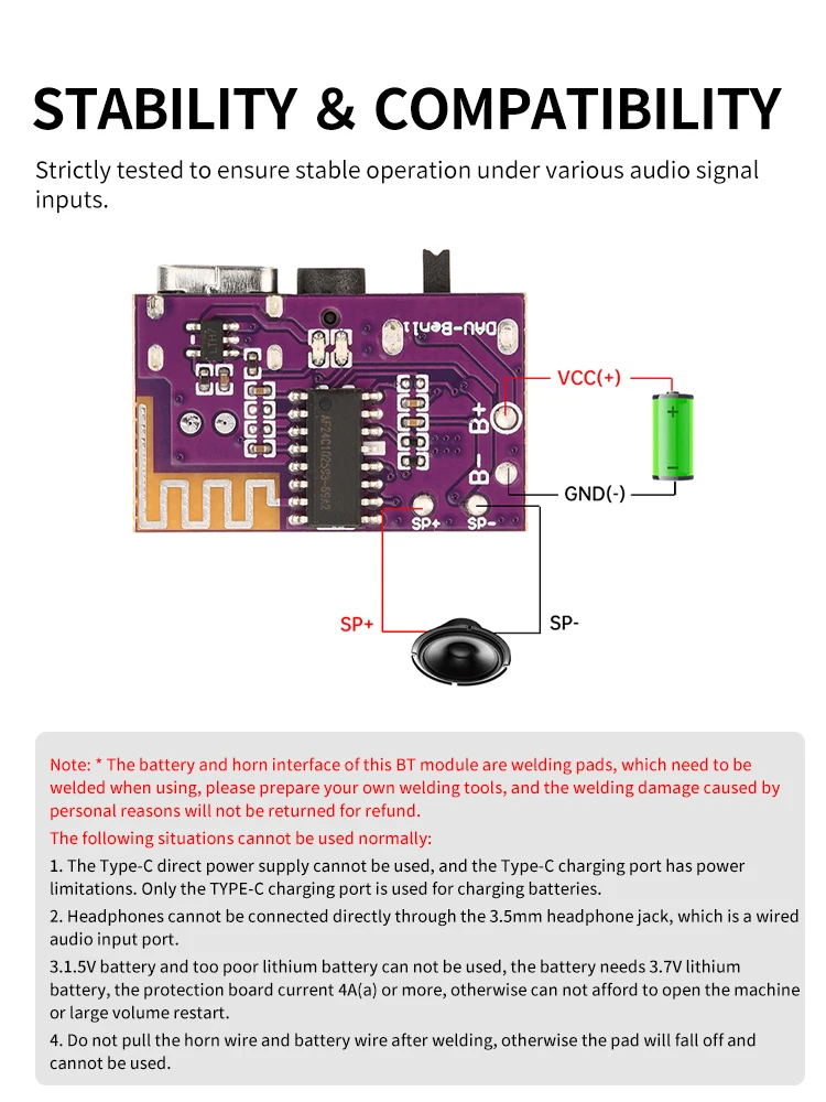 *The battery and speaker interfaces of this Bluetooth module are both solder pads, which need to be soldered during use. Please prepare your own soldering tools. Welding damage caused by personal reasons does not support returns and refunds.