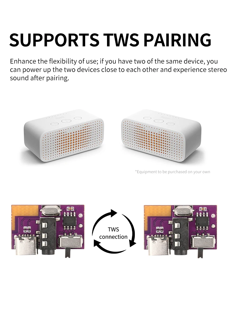 Regarding TWS pairing, if you have purchased two DAU Audio Bluetooth modules, stereo pairing is possible. You need to first turn off your phone's Bluetooth, then turn on both boards at the same time, wait for a few seconds to hear a prompt sound, and then one module's blue indicator light will remain on while the other module's indicator light will continue to flash, indicating successful TWS pairing. At this point, turn on your phone and connect to Bluetooth, and you will have a stereo wireless speaker. It is recommended to use a lithium battery with a capacity of 500mAh to 2000mAh and a capacity of 3.7V. The charger should be 5V 1A to 2A and charged using a USB 2.0 to Type-C cable.