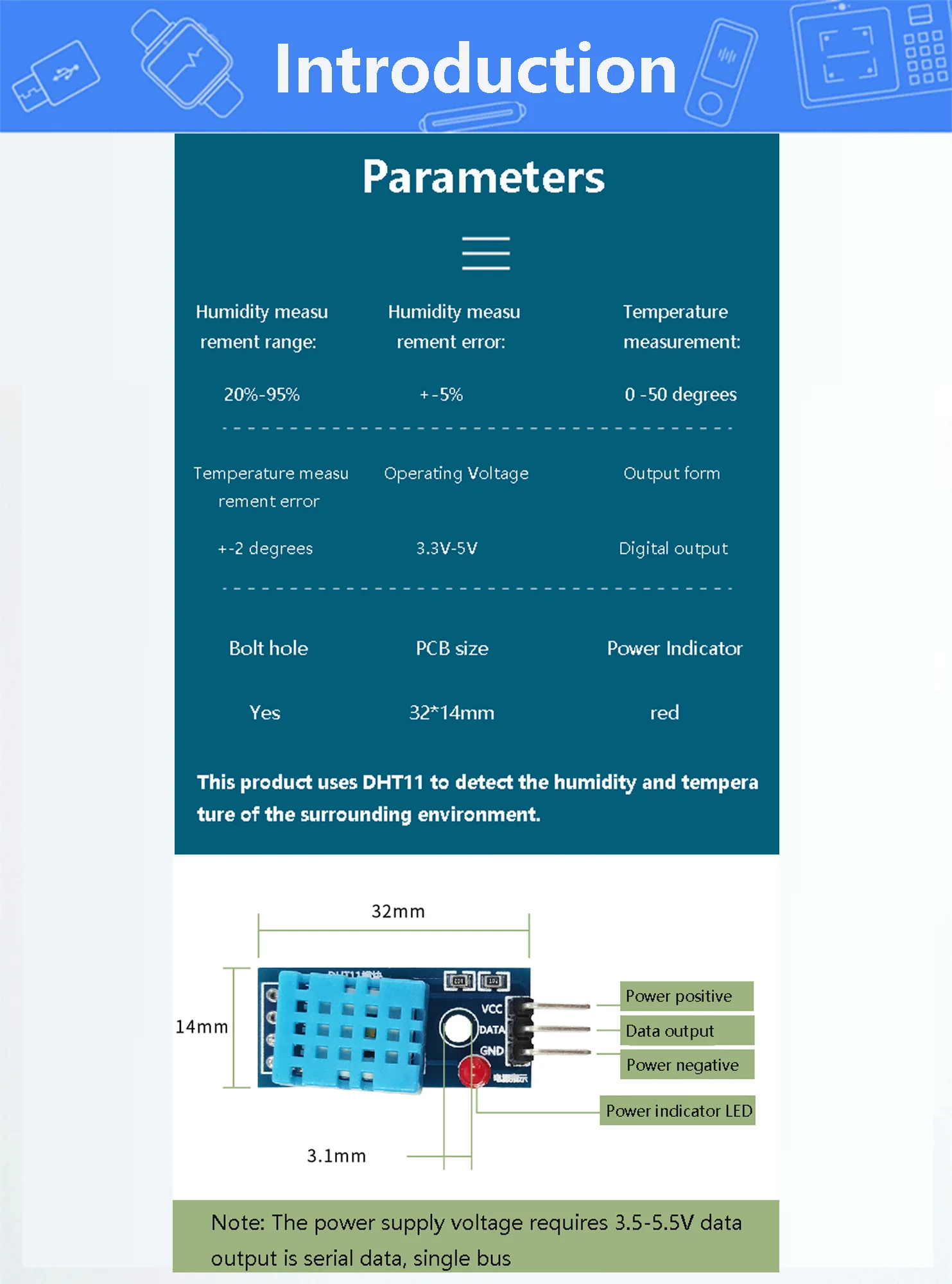 Comprar Módulo Digital de temperatura y humedad DHT11, Sensor DHT11, compatible con Raspberry Pi 3/4 con línea Dupont para Arduino DIY