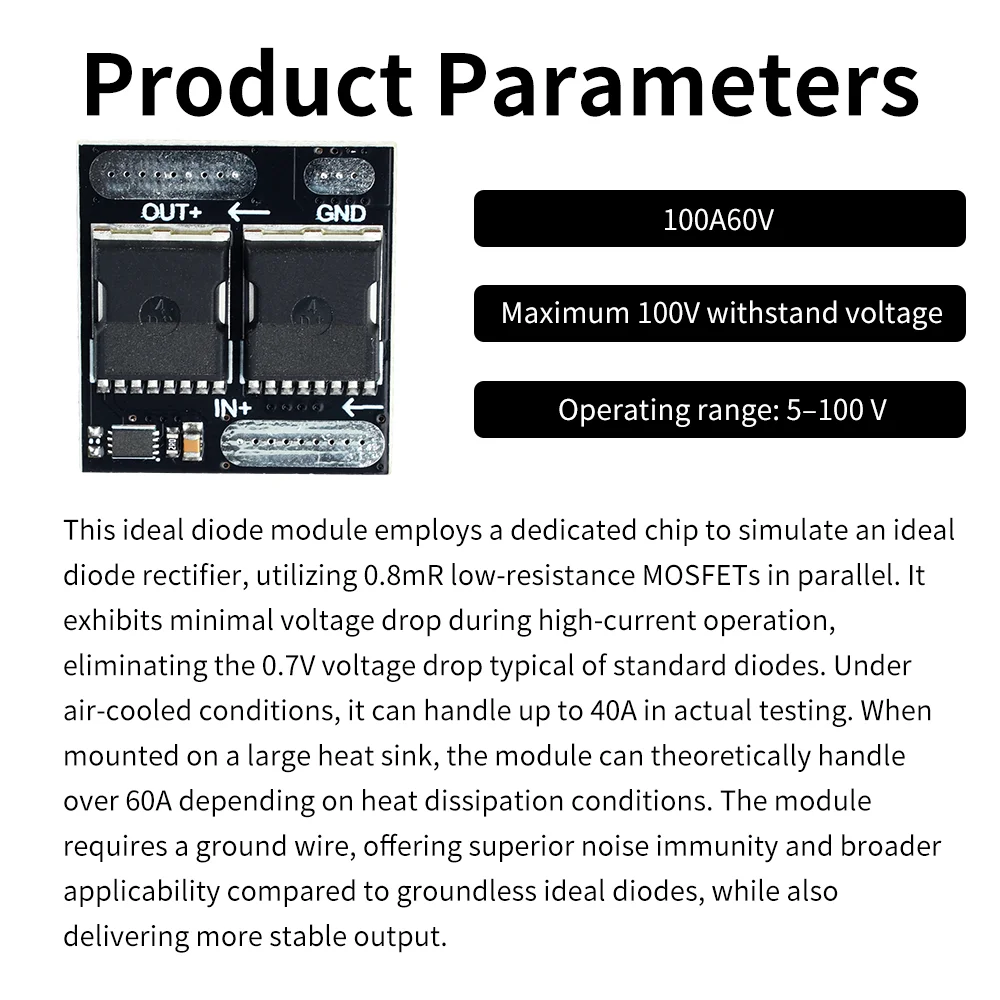 Este módulo de diodo ideal emplea un chip dedicado para simular un rectificador de diodo ideal.Utiliza dos MOSFET de baja resistencia de 0,8 mΩ en paralelo, lo que minimiza la caída de voltaje durante el funcionamiento de alta corriente y evita la caída de voltaje de 0,7 V típica de los diodos estándar.Probado en condiciones de refrigeración por aire, puede soportar 40 A.Cuando se monta en un disipador de calor grande, el módulo teóricamente puede manejar más de 60 A dependiendo de la disipación de calor.El módulo requiere una conexión a tierra, que ofrece una inmunidad al ruido superior y un rango de aplicación más amplio en comparación con los diodos ideales sin conexión a tierra, con una salida más estable.