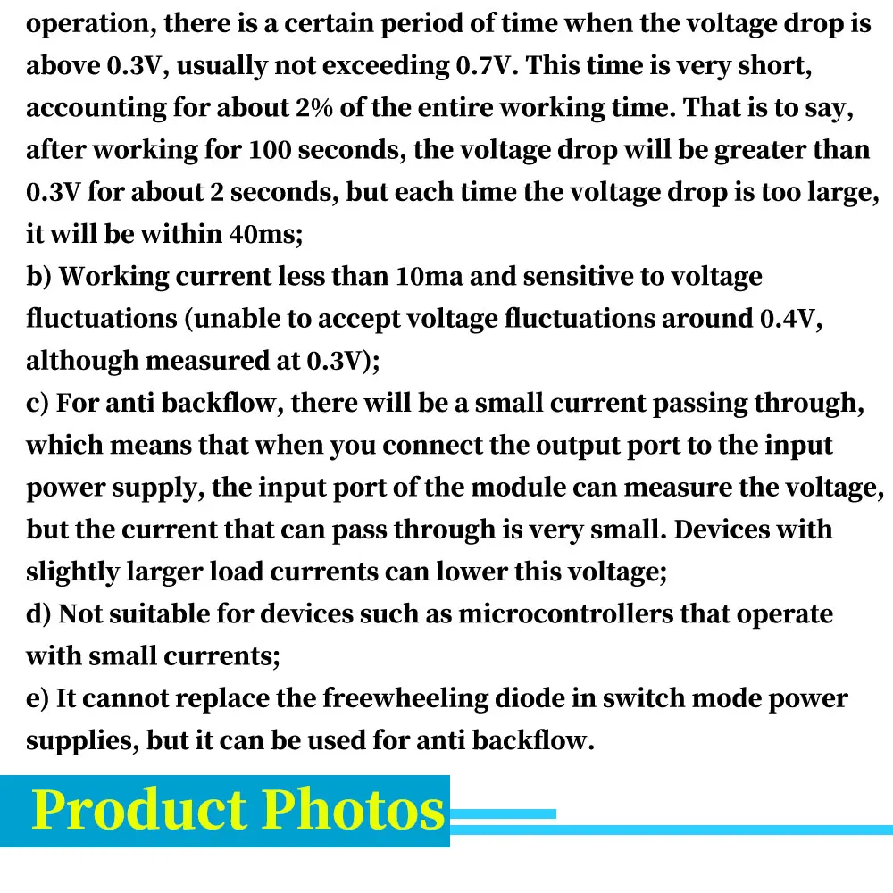 Los módulos de diodos ideales son exactamente como se describen. Probé la caída de tensión a 12V con una carga de 2.5A y es de 0.003V. Debo señalar que aproximadamente cada segundo, de manera cíclica, la caída de tensión aumenta a 0.030V por un momento (creo que 1 décima de segundo). Para mi uso en pequeños paneles fotovoltaicos, esto es irrelevante, pero es justo mencionar esta particularidad. Llegaron rápidamente. Estoy muy satisfecho.