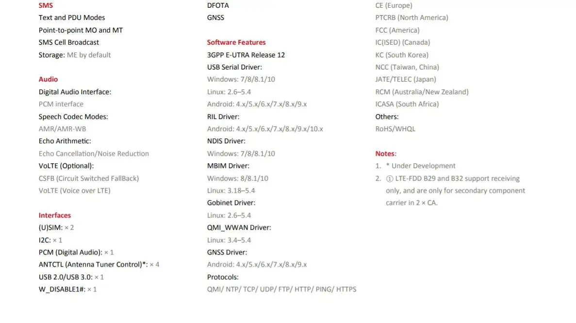 Un amplio conjunto de protocolos de Internet, interfaces estándar de la industria y abundantes funcionalidades (controladores USB para Windows 7, 8 y Windows 8.1, Windows 10, Linux, Android/eCall) extiende la aplicabilidad del módulo a una amplia gama de aplicaciones M2M e IoT, como enrutador industrial, puerta de enlace doméstica, STB, portátil industrial, portátil de consumo, PDA industrial, tablet PC robusta, videovigilancia y señalización digital, etc.