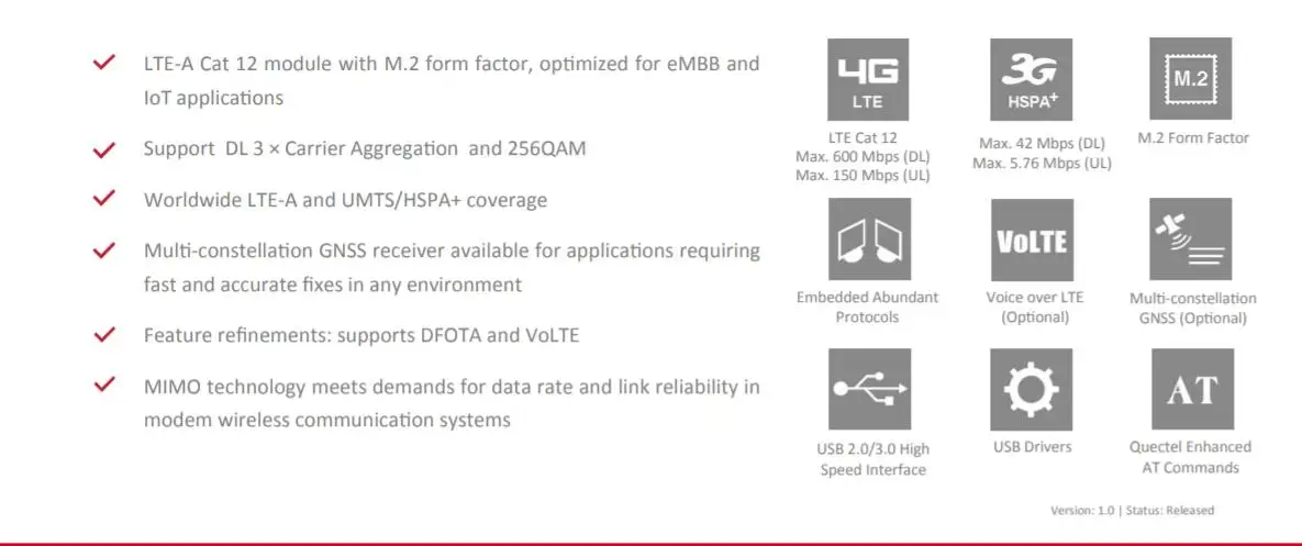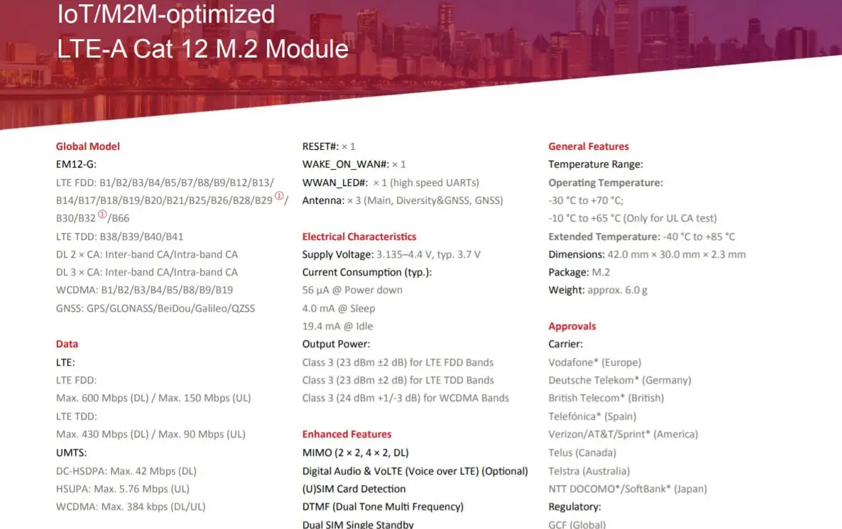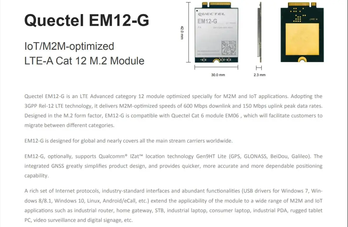 Quectel es un módulo de categoría 12 LTE Advanced, optimizado especialmente para aplicaciones M2M e IoT. Adoptando el 3GPP Rel. La tecnología 12 LTE ofrece velocidades de transmisión de datos pico de enlace descendente de 600Mbps y enlace ascendente de 150Mbps. Diseñado en el factor de forma M.2, EM12 es compatible con el módulo Quectel Cat6 EM06 y el futuro módulo Cat 16 EM16, lo que facilitará a los clientes migrar entre diferentes categorías.