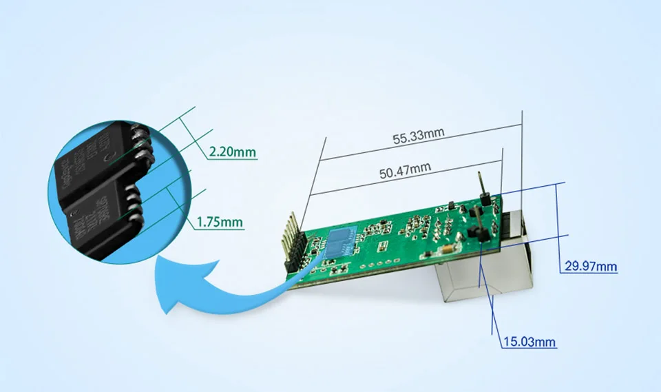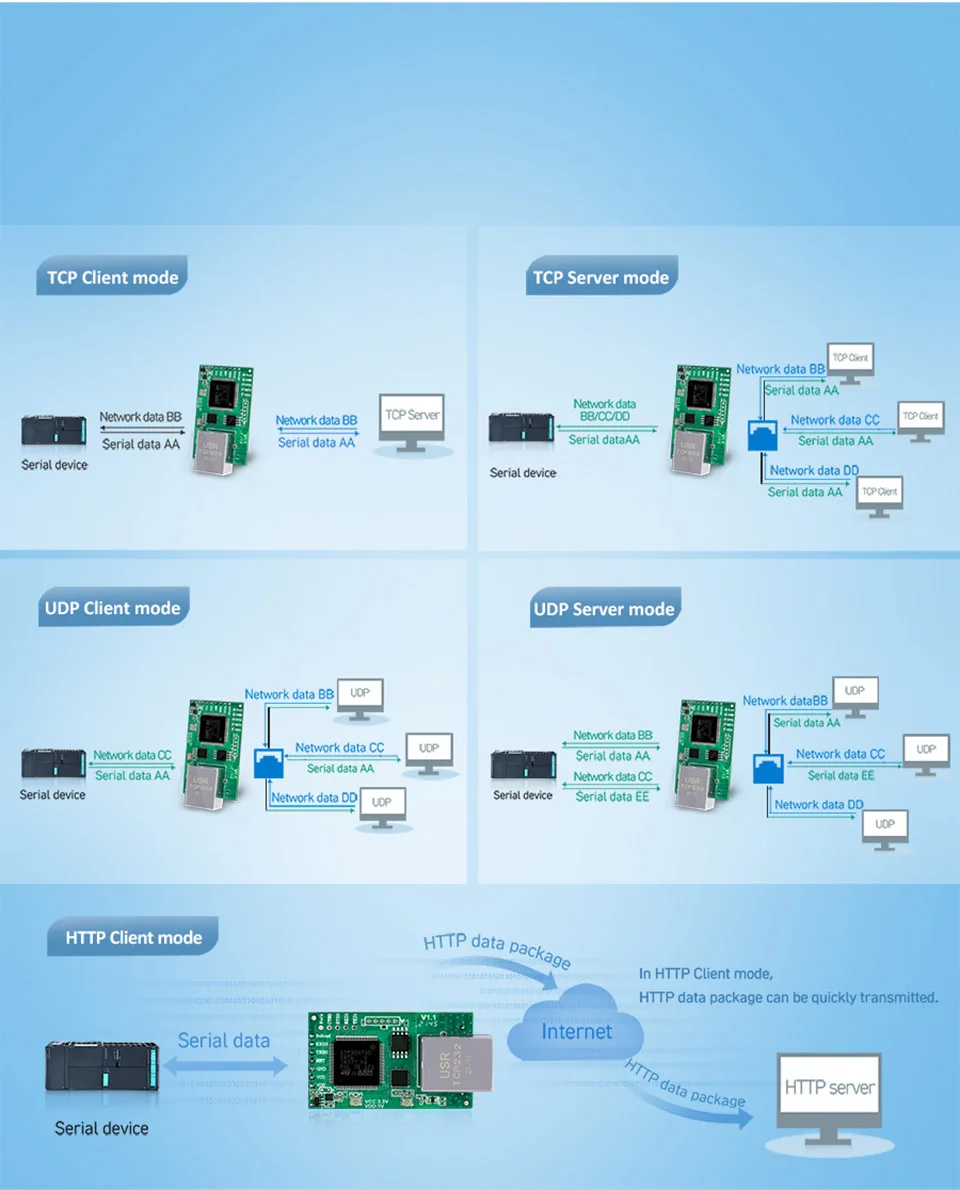 Este es un módulo serie TTL a Ethernet, utilizado para la transmisión transparente de datos. Se puede utilizar para transferir paquetes de red TCP o UDP con datos de interfaz TTL, logrando una transmisión transparente. Este equipo tiene caracteres de tamaño pequeño, bajo consumo de energía, procesador ARM, velocidad rápida y alta estabilidad.