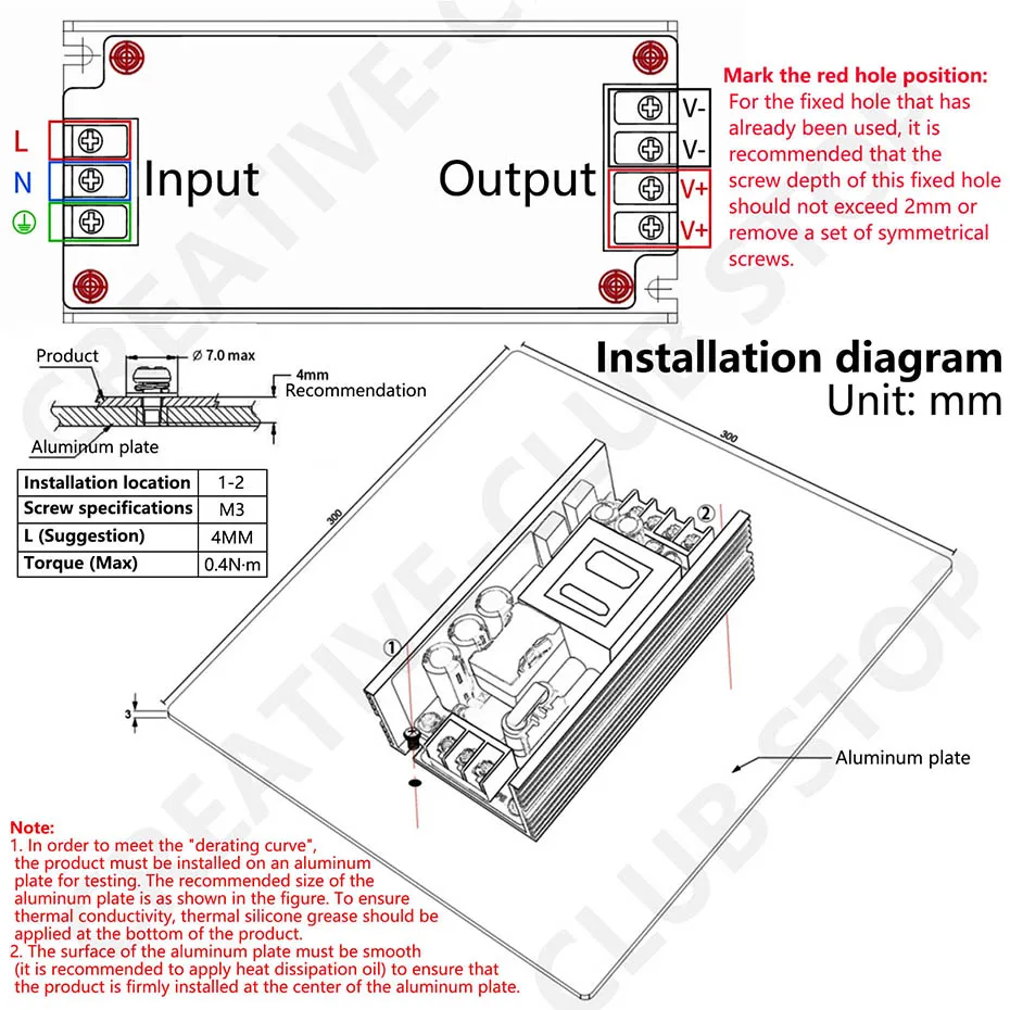 1. Para cumplir con la "Curva de reducción", el producto debe instalarse en una placa de aluminio para su prueba. El tamaño recomendado de la placa de aluminio es el que se muestra en la figura. Para garantizar la conductividad térmica, se debe aplicar grasa térmica de silicona en la parte inferior del producto.