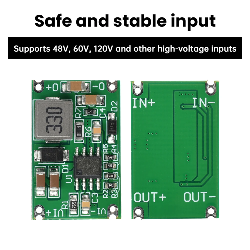 Características del producto: 1.Entrada segura y estable: admite una variedad de entradas de alto voltaje, incluidas 48 V, 60 V y 120 V. 2.Salida de voltaje múltiple: voltajes de salida seleccionables de 3,3 V, 5 V y 12 V para satisfacer las necesidades de regulación de voltaje del dispositivo. 3.Conversión reductora de alta eficiencia: alta eficiencia de conversión, baja generación de calor y funcionamiento estable y confiable. 4.Salida de corriente estable: corriente de salida máxima de 1 A, baja corriente de reposo, adecuada para operaciones en espera a largo plazo.