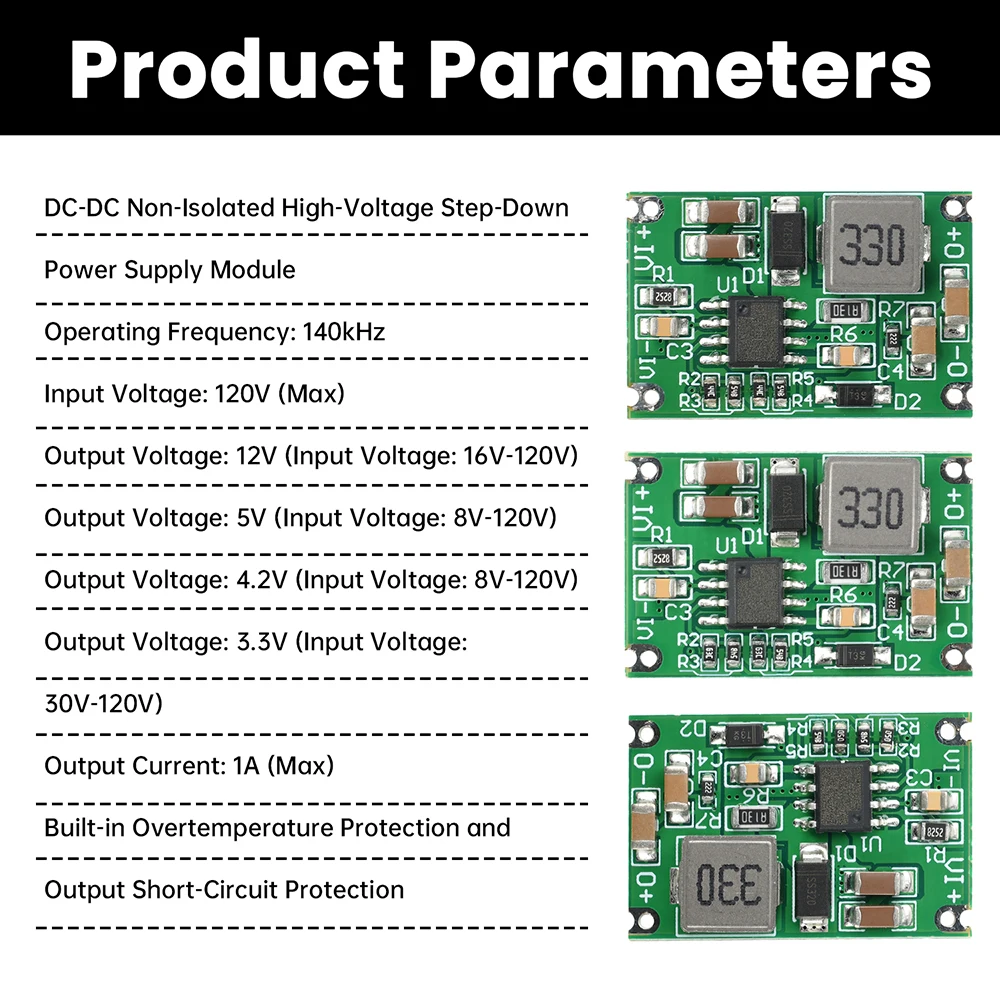 Parámetros del producto: Módulo de fuente de alimentación reductor de alto voltaje no aislado DC-DC Frecuencia de funcionamiento: 140khz Voltaje de entrada: 120 V (máximo) Voltaje de salida: 12 V (voltaje de entrada: 16 V-120 V) Voltaje de salida: 5 V (voltaje de entrada: 8 V-120 V) Voltaje de salida: 4,2 V (voltaje de entrada: 8 V-120 V) Voltaje de salida: 3,3 V (voltaje de entrada: 30 V-120 V)
