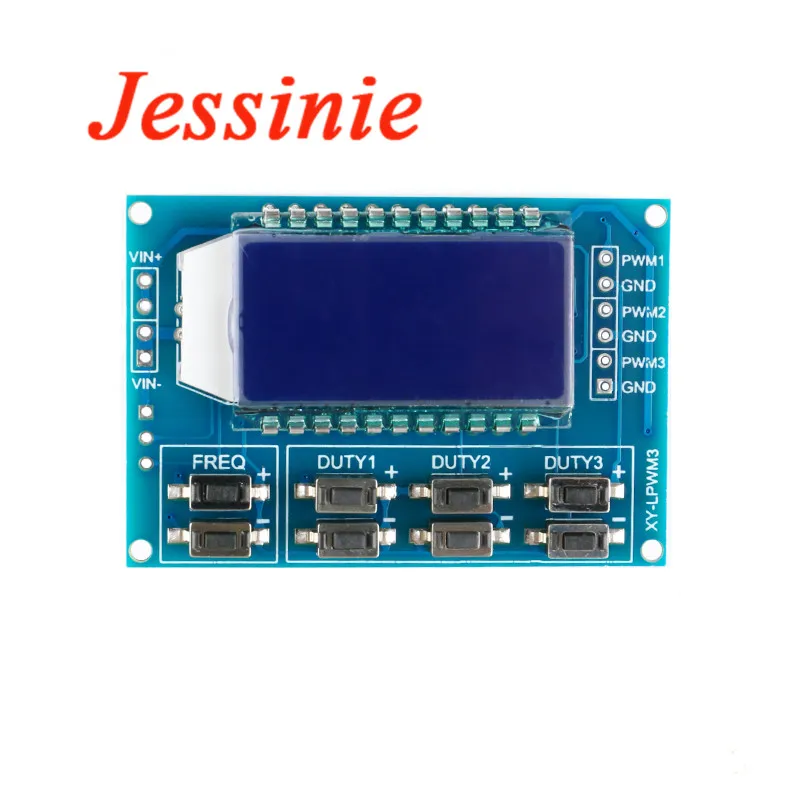 Módulo destacado1. Salida PWM de tres vías, frecuencia ajustable, salida de frecuencia de tres vías, el ciclo de trabajo se puede ajustar de forma independiente, adecuado para la mayoría de las ocasiones;2. Frecuencia LCD y ciclo de trabajo de la pantalla de cristal líquido, muy clara, muy fácil de ajustar3. Amplio rango de frecuencia y alta precisión;4. Comunicación serieDescripción del móduloSalida PWM de 3 vías, amplio rango de frecuencia, el ciclo de trabajo se puede ajustar de forma independiente en tiempo real;La frecuencia se divide en cuatro rangos, cambiando automáticamente:1.XXX (sin punto decimal): la unidad mínima Hz es 1, el rango de valores es 1Hz ~ 999Hz;2.X.XX (el punto decimal está en cien lugares) es 0,01 Khz, el rango de valores es 1,00 Khz ~ 9,99 Khz;3.X X.X (punto decimal en diez): La unidad mínima es 0,1 Khz; el rango de valores es 10,0 KHz ~ 99,9 KHz4.X.X.X (punto decimal en diez y cientos): La unidad mínima es 1Khz; el rango de valores es 1KHz ~ 150KHzPor ejemplo. Visualización de frecuencia: 100 representa el pulso de 100Hz de salida PWM;1,01 representa el pulso de salida PWM 1,01 K;54,1 indica el pulso de salida PWM 54,1 KHz;1.2.4 indica pulso de salida PWM de 124KHz;Los valores del ciclo de trabajo oscilan entre 0 y 100%, donde 100% se expresa en A %.Todos los parámetros de configuración se guardan después del apagado.