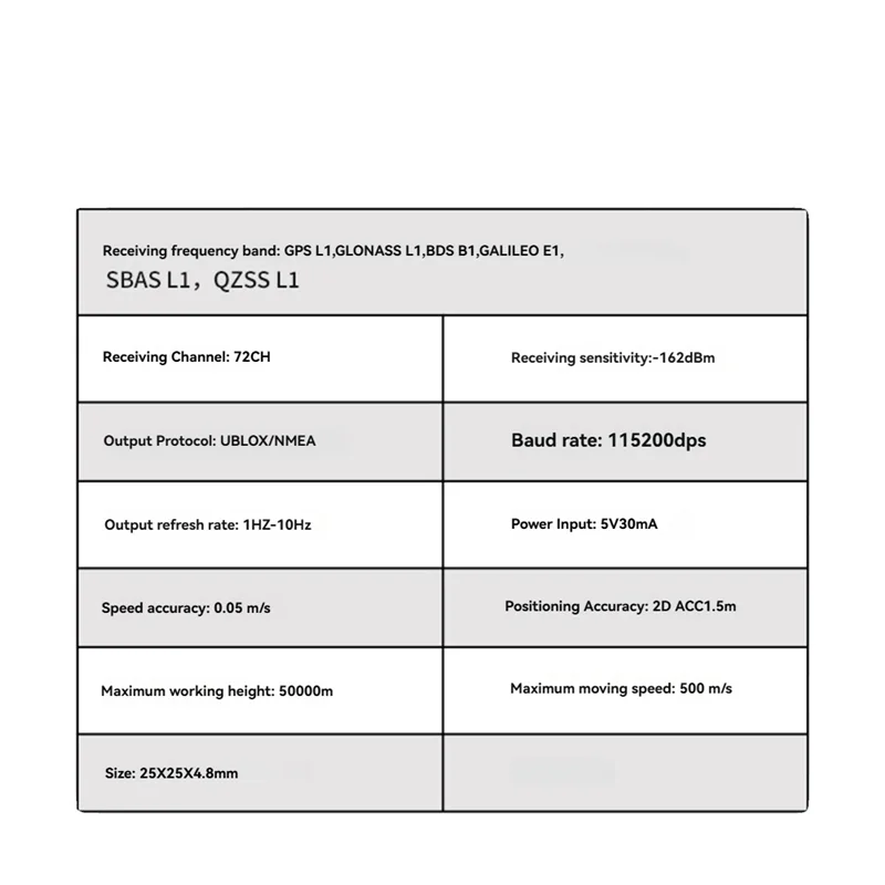Banda de frecuencia de recepción: GPSL1,GLONASSL1,BDS B1,GALILEO E1, SBAS L1,QZSS L1