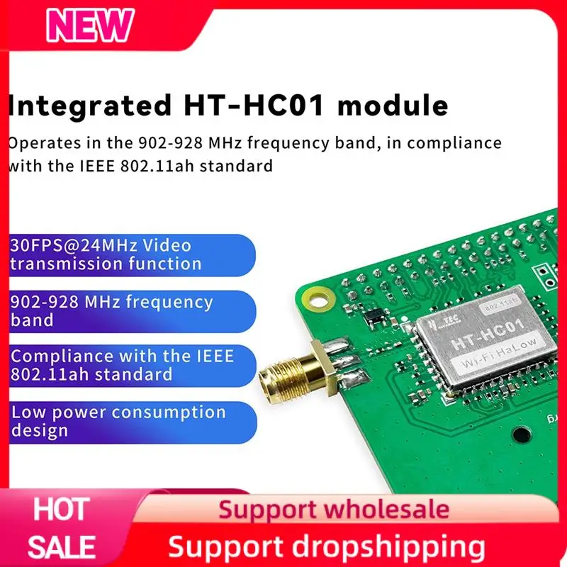 El módulo HT-HC01 proporciona comunicación Wi-Fi HaLow para Pi-CamLow.Este módulo opera en la banda de frecuencia de 902-928 MHz, de conformidad con el estándar IEEE 802.11ah.Ofrece una velocidad de transmisión máxima de 32,5 Mbps a 8 M, una potencia de transmisión máxima de 21 dBm y un rango de transmisión de 1-2 km.Creemos que la excelente transferencia de datos del Wi-Fi HaLow combinada con la potente cámara brindará más posibilidades para su desarrollo y aplicación de Raspberry PI.