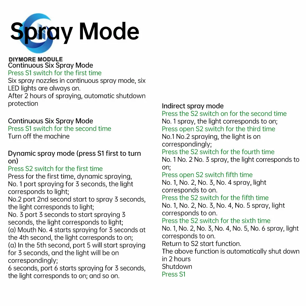 3. Seis boquillas de pulverización, soporte para seis pulverizadores, pulverización dinámica, puede ser de una sola pulverización, puede ser de múltiples modos de pulverización.