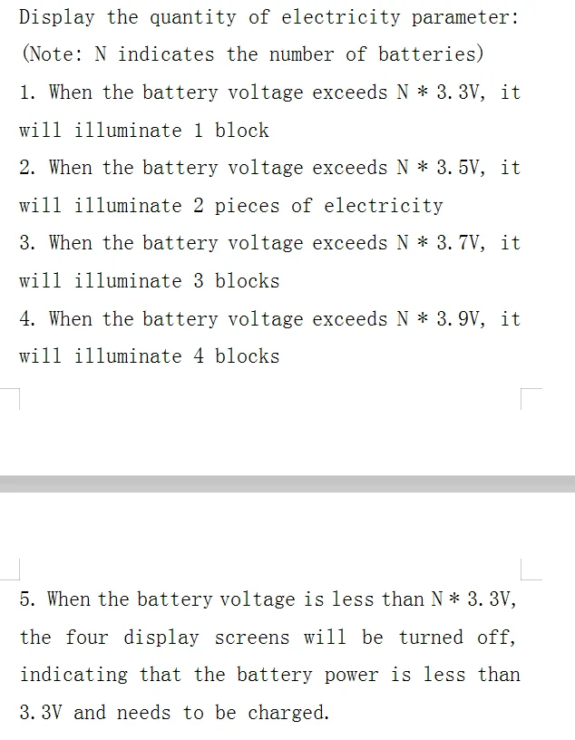 1. Cuando el voltaje de la batería es superior a N * 3,3 V, se iluminará 1 bloque de cantidad de electricidad
