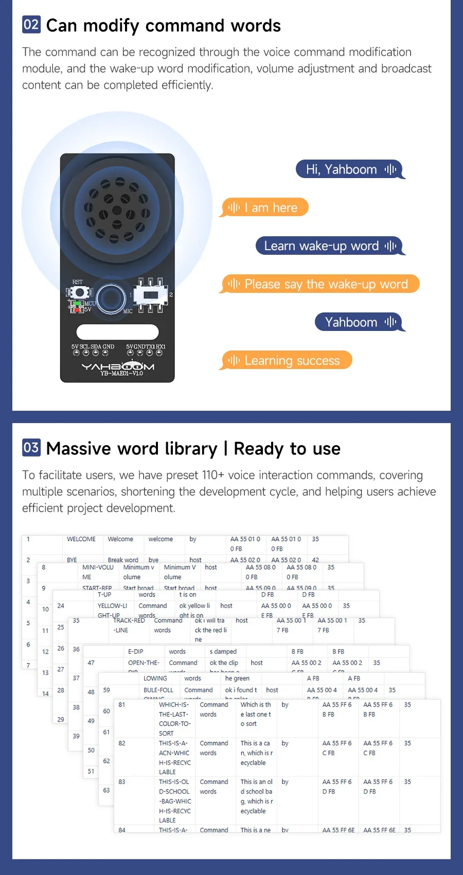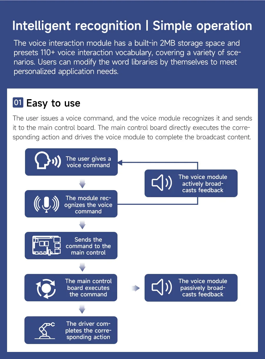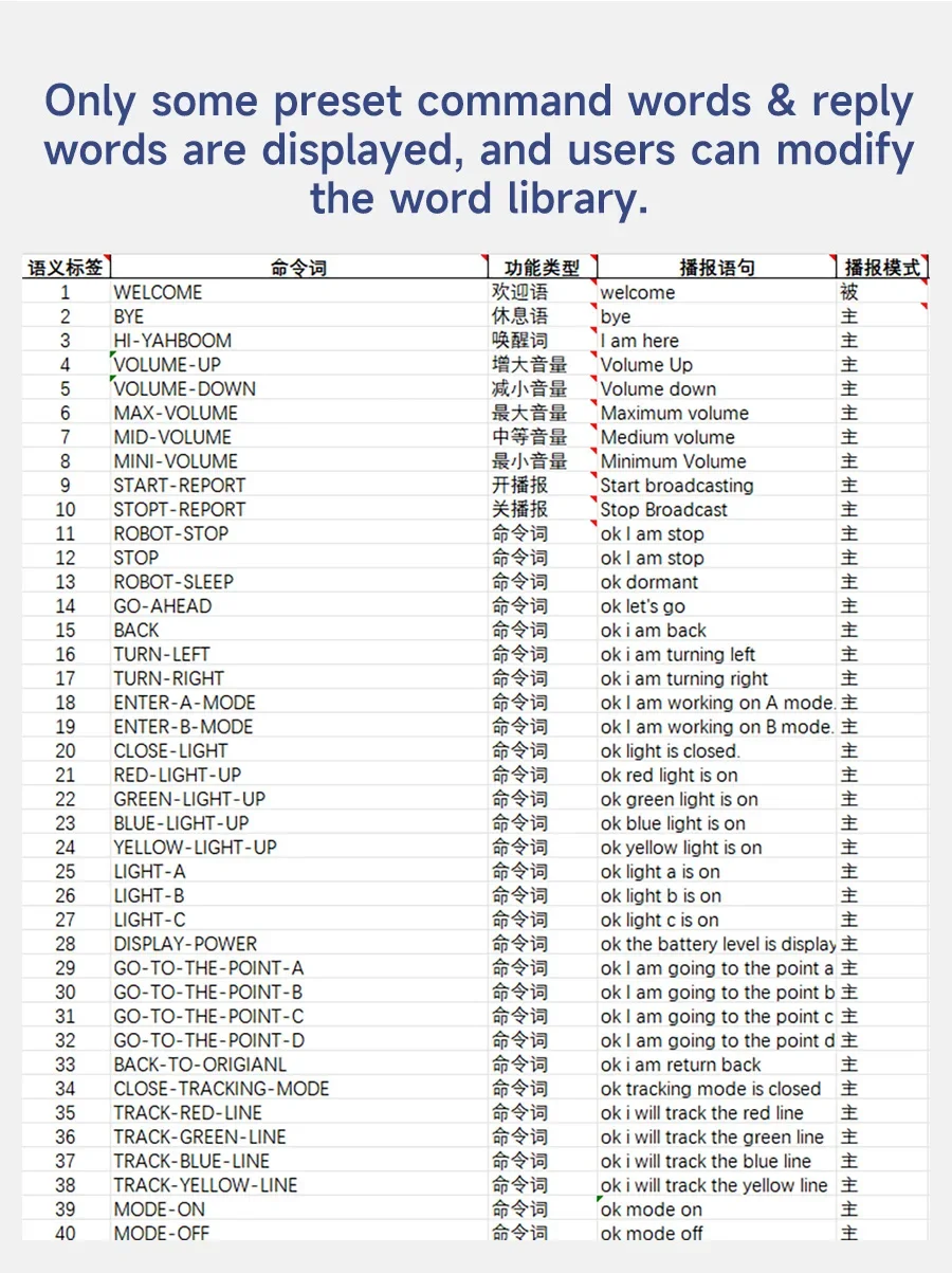 Preestablezca más de 110 comandos de voz, admite palabras de comando personalizadas en chino e inglés