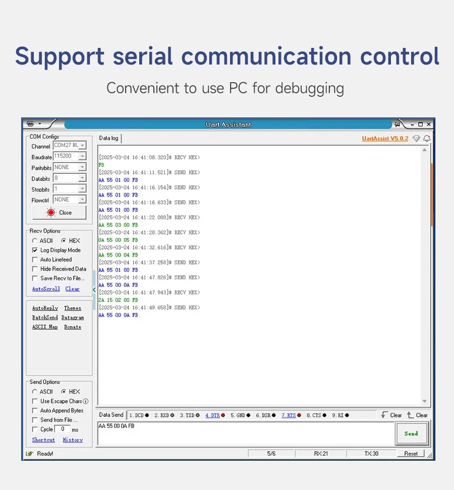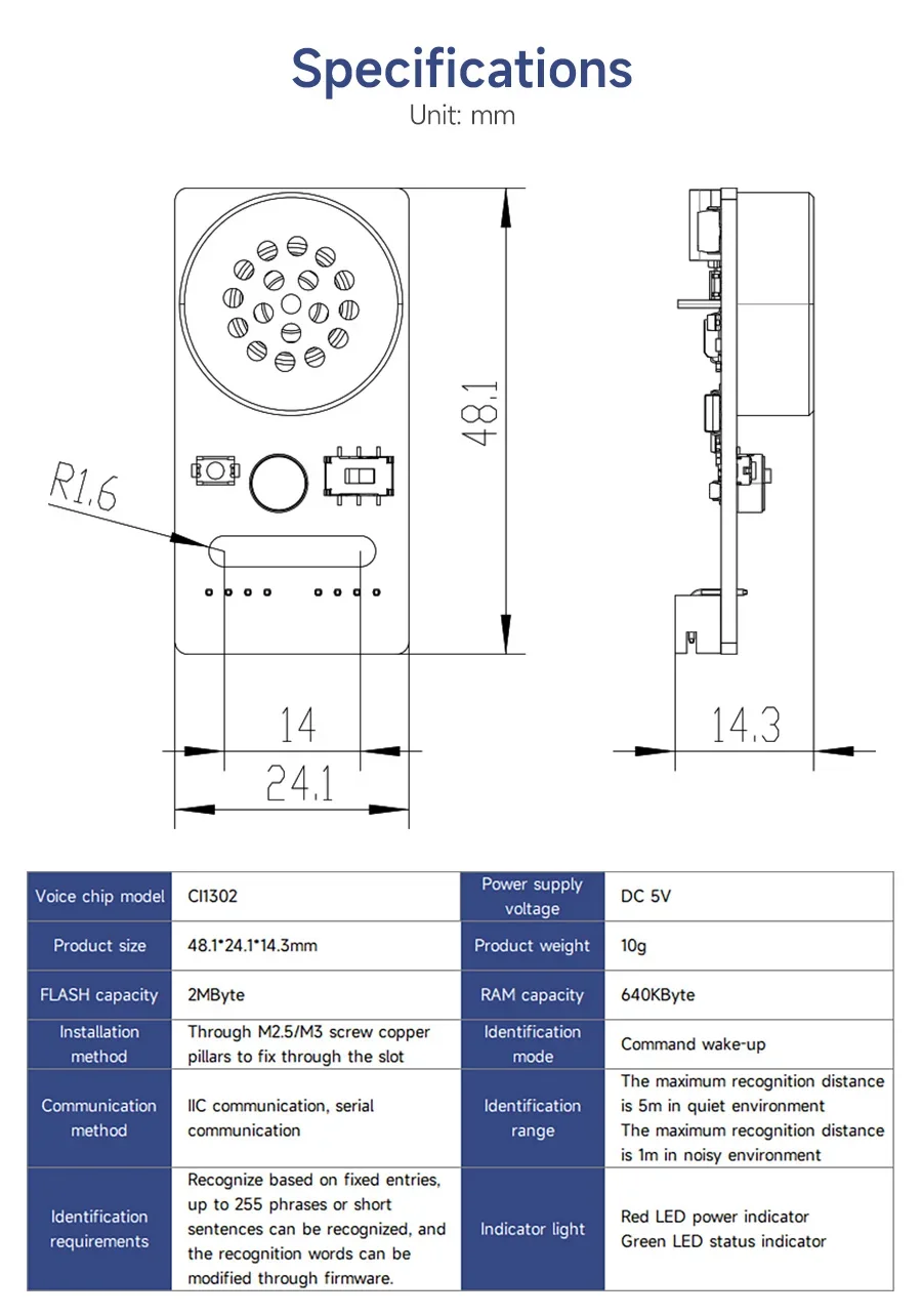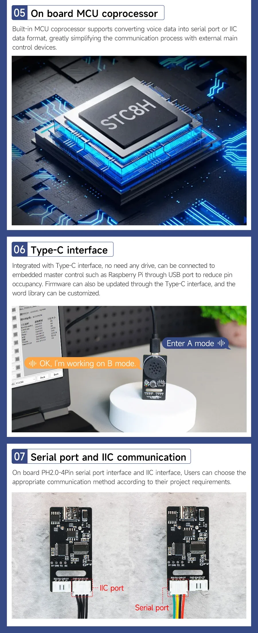 ◆Integra el chip STC8H, que puede convertir automáticamente datos de voz en puerto serie o formato de datos IIC, simplificando el proceso de comunicación con dispositivos maestros externos.