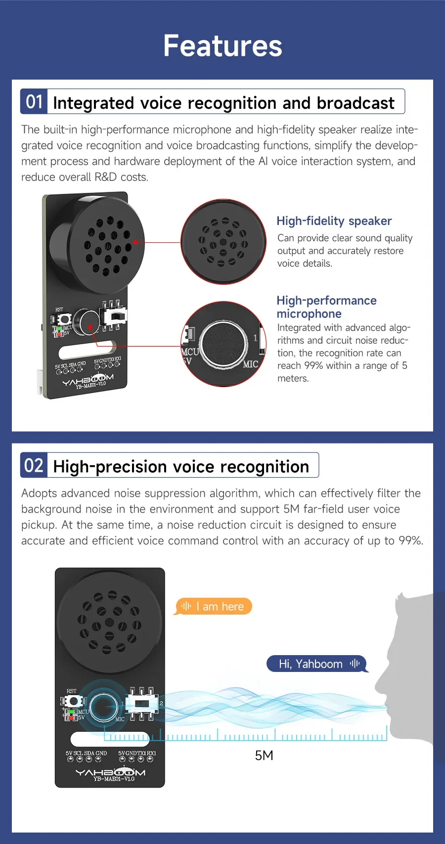 ◆Integrado con algoritmos avanzados y reducción de ruido del circuito, puede filtrar eficazmente el ruido de fondo en el entorno y la tasa de reconocimiento puede alcanzar el 99% dentro de un rango de 5M, logrando así una conversación natural y una cancelación de eco.