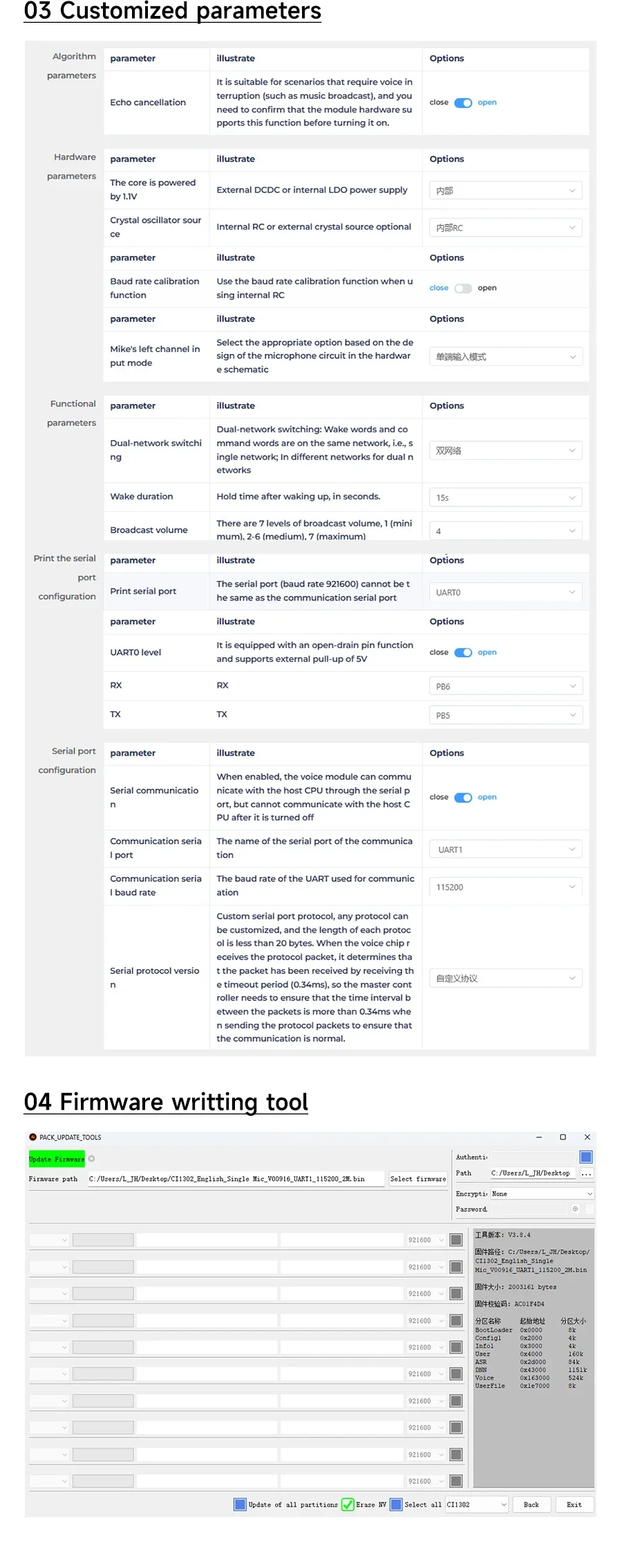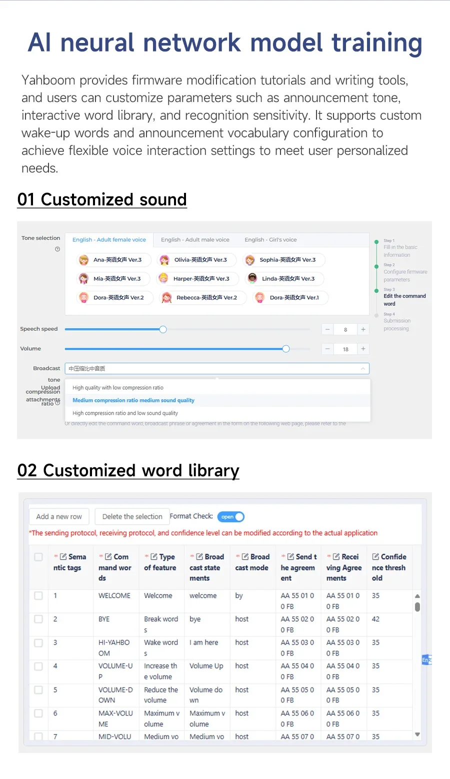 ◆Los usuarios pueden modificar las palabras de comando a través de la página web exclusiva que proporcionamos, generar un nuevo archivo de firmware y escribir el firmware al módulo a través del software de la PC; el módulo reconocerá nuevos comandos.