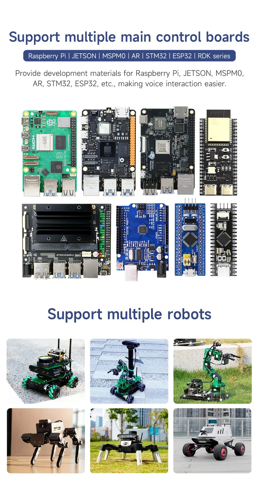 ◆ Proporcione información de la placa de desarrollo como STM32, ESP32, MSPM0, AR, Raspberry Pi, placas de la serie jetson, RDK, etc. Y proporcione archivos SDK para sistemas ROS1 y ROS2.