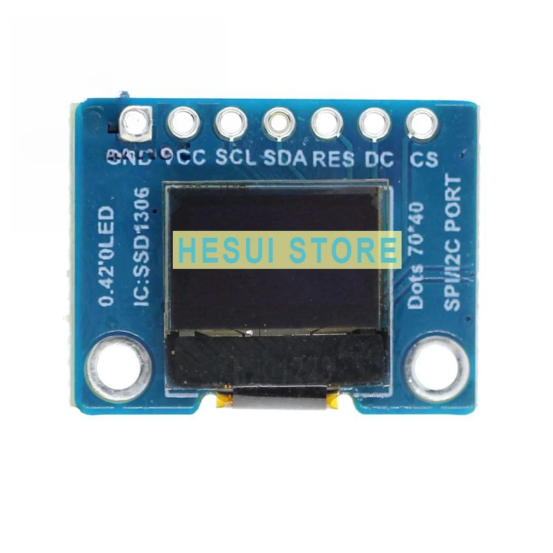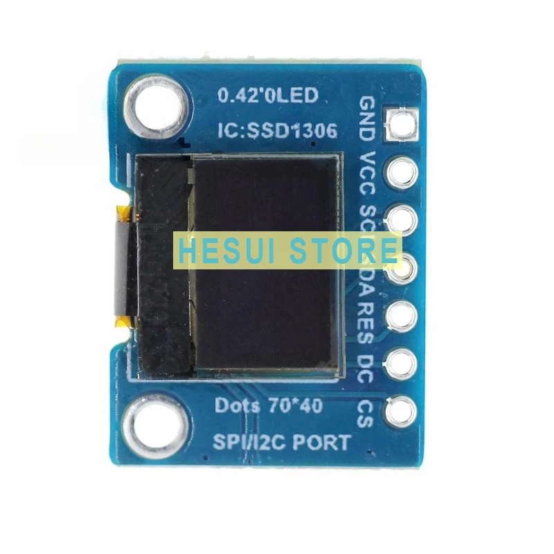 Características principales:Tamaño: 0,42"Píxeles: 72X40 píxelesInterfaz de CPU: SPIControlador IC: SSD1306Color de la pantalla: blancoGráfico OLED