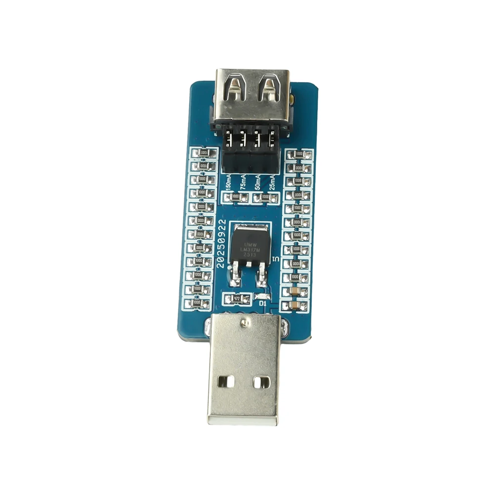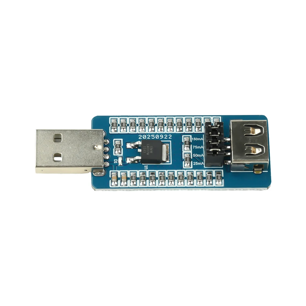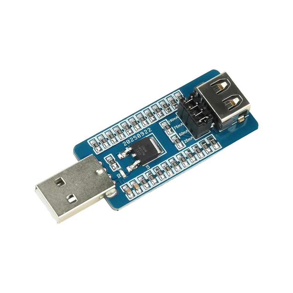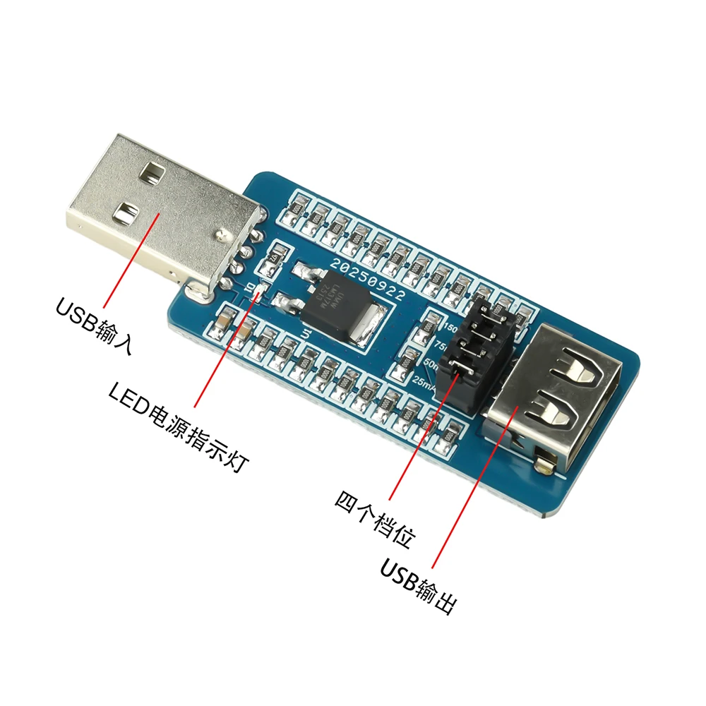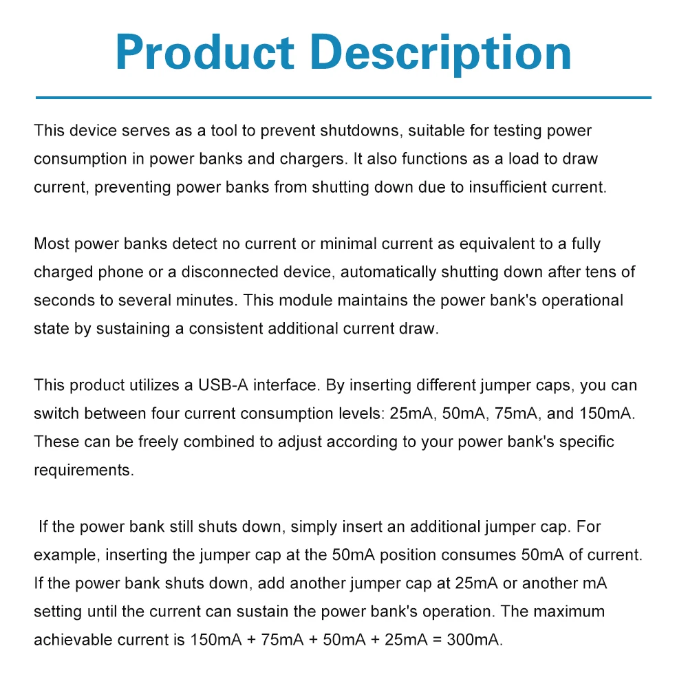 Como herramienta para mantener la energía encendida, el producto se puede utilizar para pruebas de consumo de energía de bancos de energía, cargadores, etc.También se puede utilizar como carga para consumir corriente y evitar que los bancos de energía se apaguen debido a la baja corriente.La mayoría de los bancos de energía, cuando no detectan corriente o muy baja corriente, son como teléfonos completamente cargados o desconectados.Después de varios segundos a minutos, se apagarán automáticamente.Este módulo mantiene una cierta cantidad de consumo de corriente adicional para mantener el banco de energía encendido.Este producto utiliza una interfaz USB-A y puede cambiar la corriente consumida conectando y desconectando la tapa del puente.Hay cuatro configuraciones: 25ma, 50ma, 75ma y 150ma, que se pueden combinar y ajustar según la situación real del banco de energía.Si no puede mantener la alimentación encendida, se puede conectar una tapa de puente adicional.Por ejemplo, insertarlo en una posición de 50 mA consume 50 mA de corriente.Si el banco de energía está apagado, inserte otro 25 mA u otro mA hasta que la corriente pueda mantener encendida el banco de energía.La corriente máxima que se puede lograr es 150+75+50+25mA=300mA