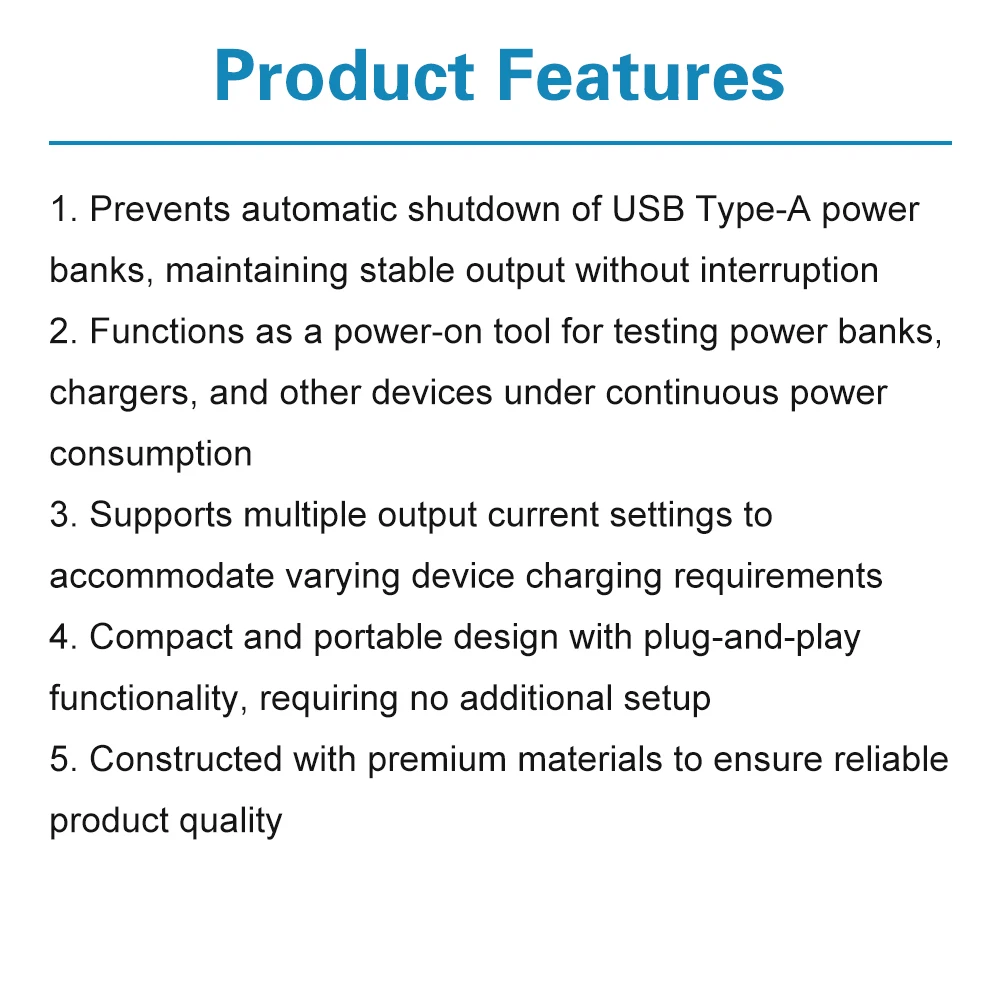 2.Como herramienta para mantener el dispositivo encendido, el producto se puede utilizar para probar el consumo de energía de bancos de energía, cargadores, etc.