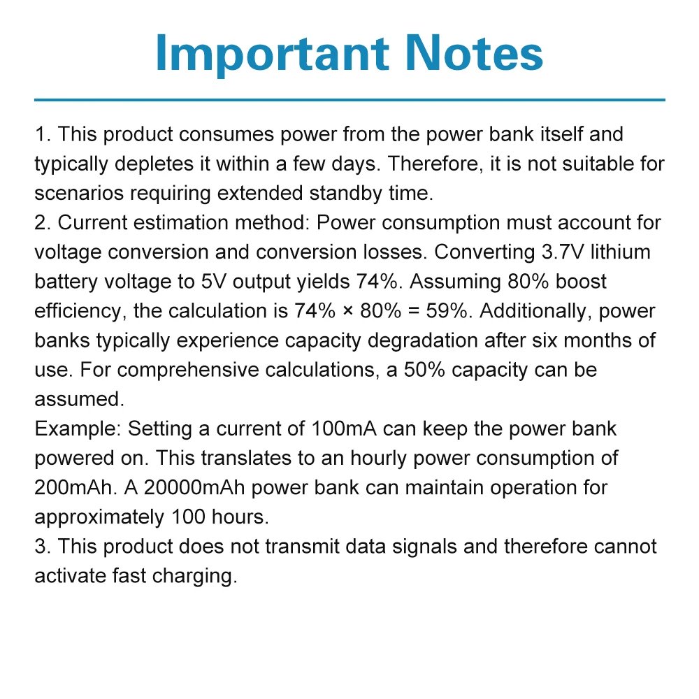 Por ejemplo, configurar la corriente a 100 mA puede mantener el banco de energía encendido, que se puede convertir a un consumo de energía de 200 mAh por hora.Un banco de energía de 20000 mAh puede mantener la energía encendida durante aproximadamente 100 horas.