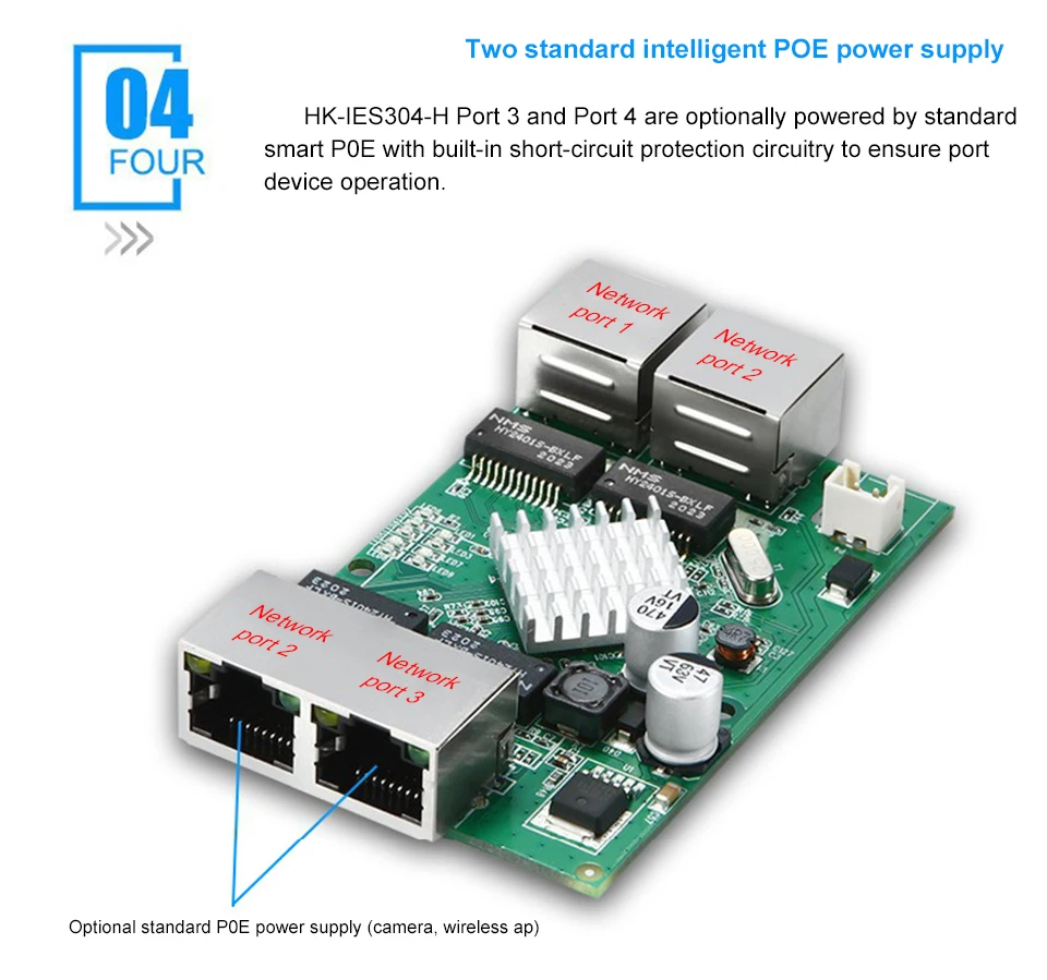 Comprar Módulo de interruptor Gigabit de 4 puertos PCBA estándar fuente de alimentación POE industrial micro amplio voltaje 48V placa base PCBA no administrada