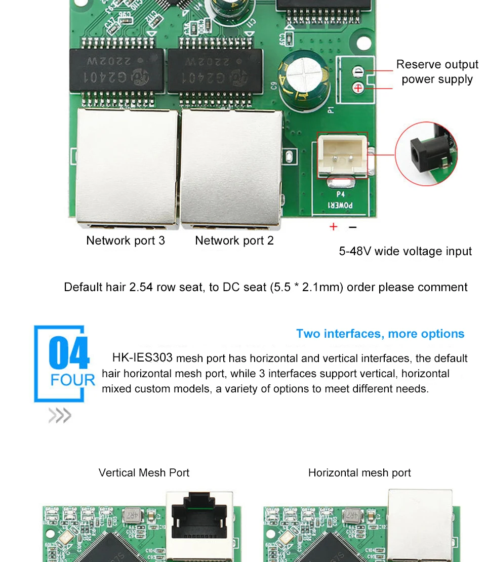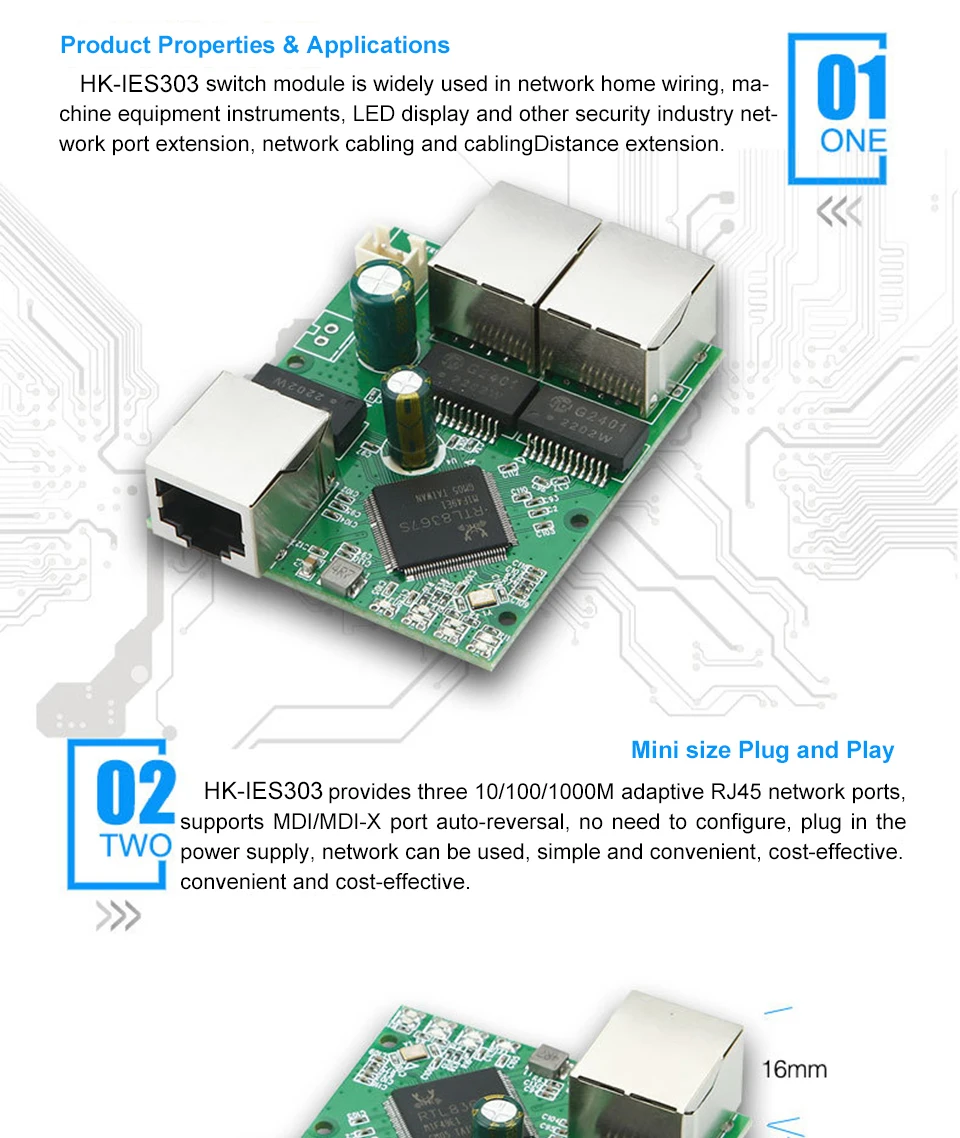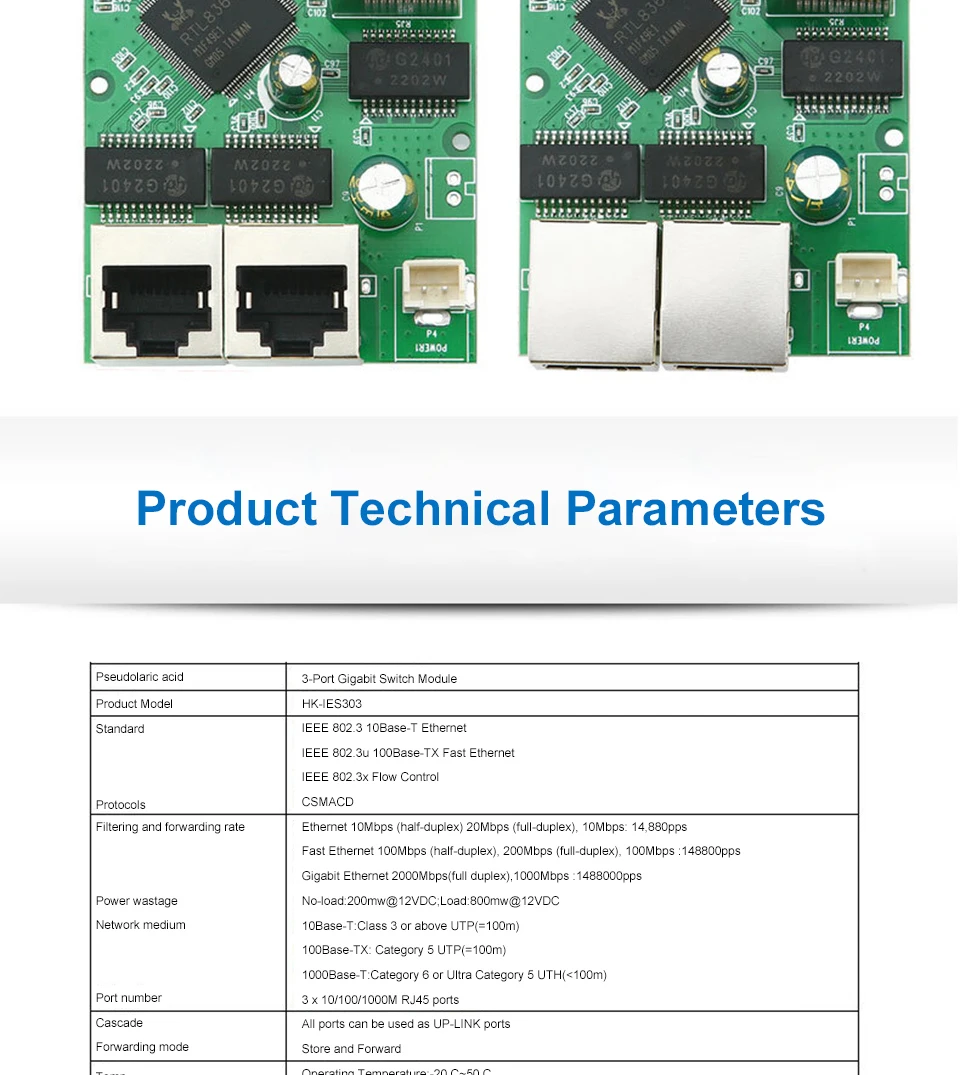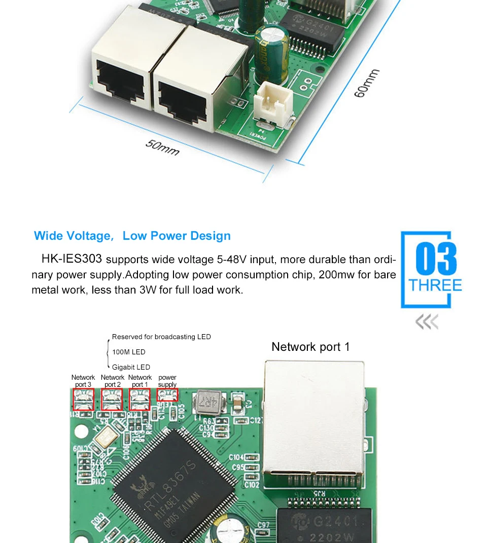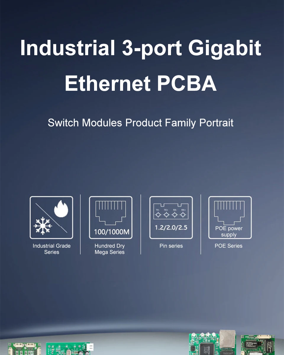 Módulo de interruptor Gigabit Ethernet de 3 puertos de grado Industrial, placa base interna PCBA de dispositivo de transmisión de red uno a dos