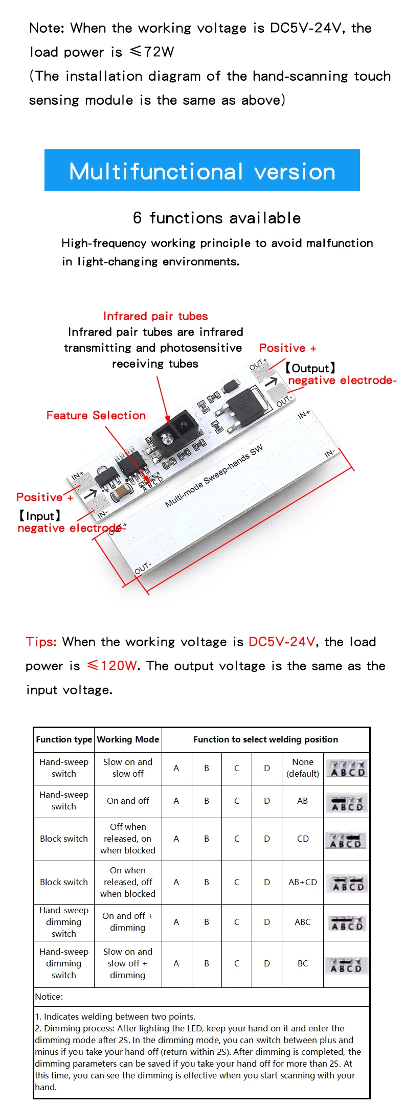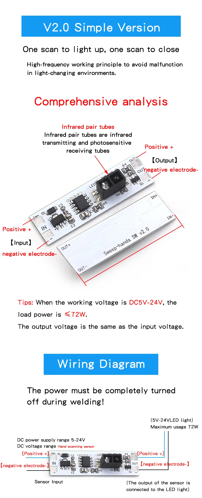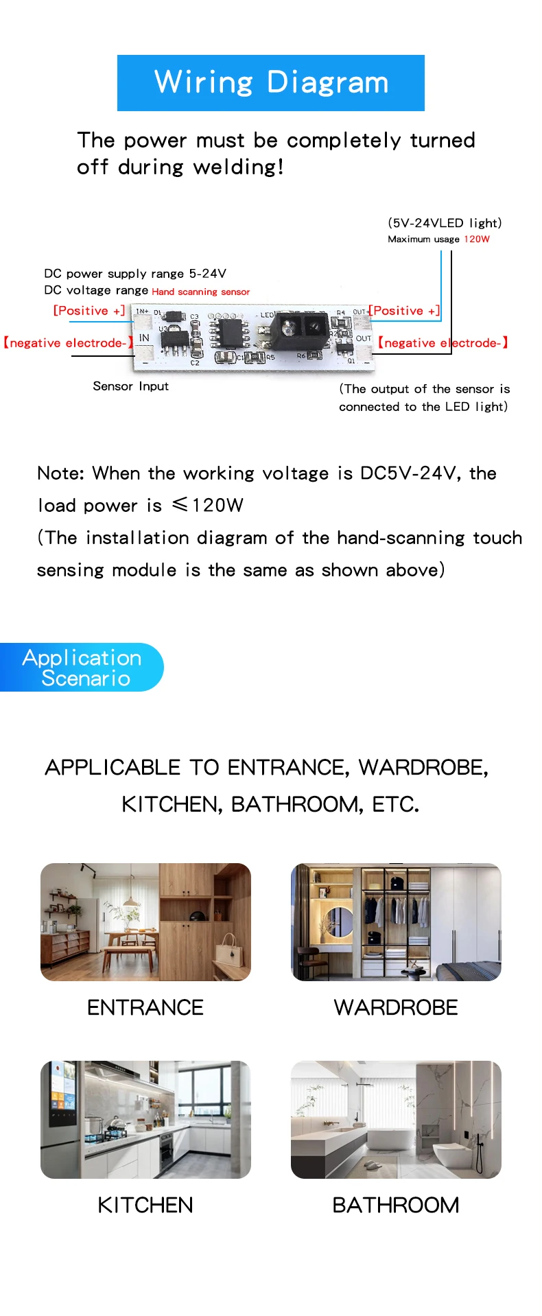 Módulo de interruptor con sensor de barrido manual y onda, adecuado para armario interior de 5V-12V-24V 72W, luz LED para zapatero