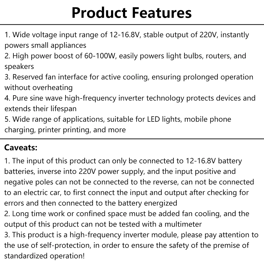 3.Este producto es un módulo inversor de alta frecuencia.Asegúrese de la seguridad personal y utilícelo de acuerdo con las pautas de seguridad.