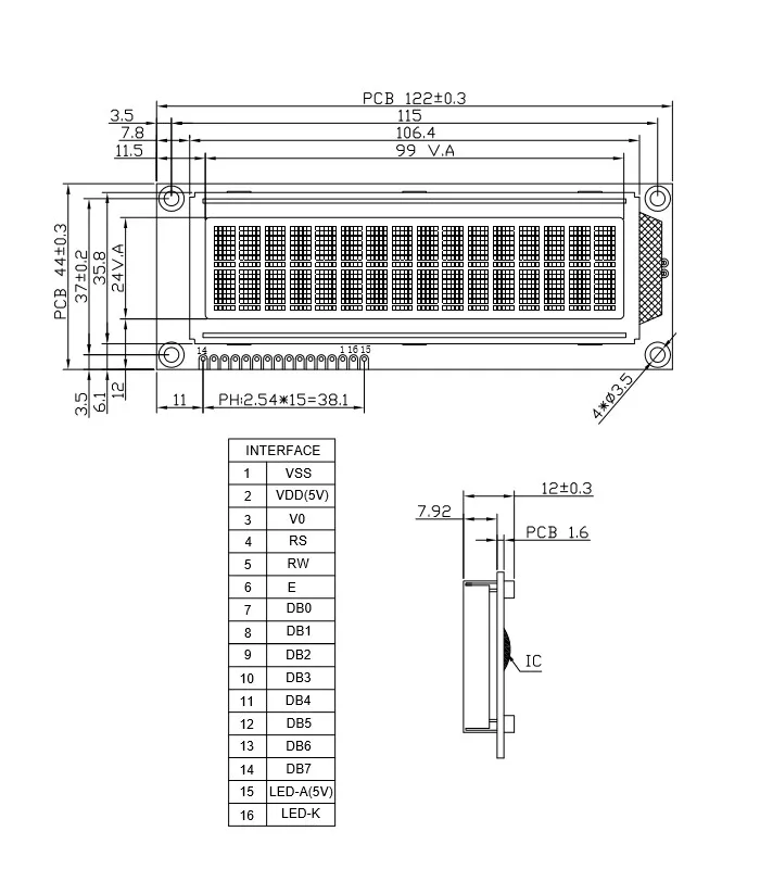 Modelo LCM1602B Paquete COB Dimensiones 122,0mm × 44,0mm Método de conexión Cinta conductora Ver tamaño 99,0mm × 24,0mm Método de interfaz Puerto paralelo de una sola fila Tamaño del punto 0,92mm × 1,10mm LED tipo retroiluminación Tamaño del personaje 8,06mm × 4,84mm Retroiluminación color blanco Mostrar contenido 16 caracteres × 2 líneas Voltaje de funcionamiento + 5V / + 3,3 V Controlador SPLC780D El paquete incluye:1 x Nuevo 1602 16X2 Pantalla de visualización del módulo LCD de caracteres LCM