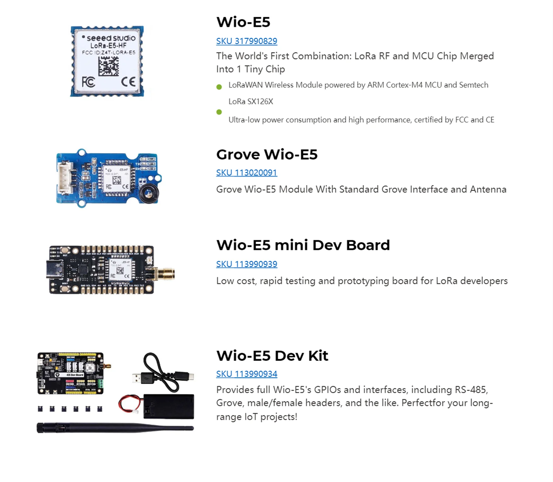 Para facilitar su desarrollo, hemos diseñado Wio-E5, Grove Wio-E5, Wio-E5 mini Dev Board y Wio-E5 Dev Kit que puede elegir según sus necesidades para acelerar el desarrollo de su proyecto.