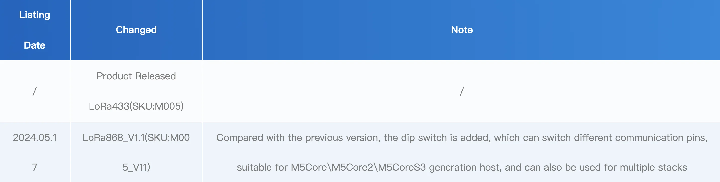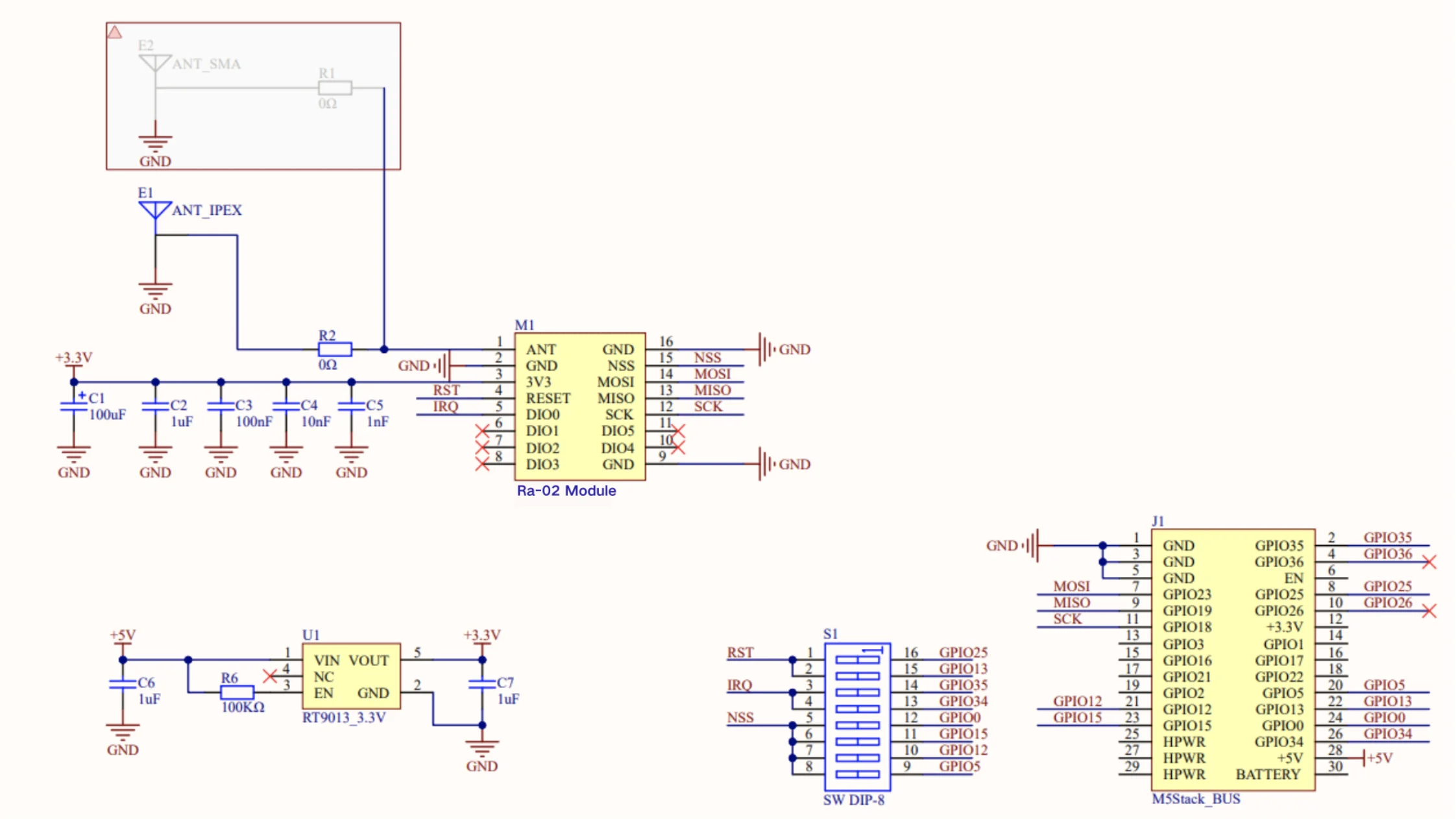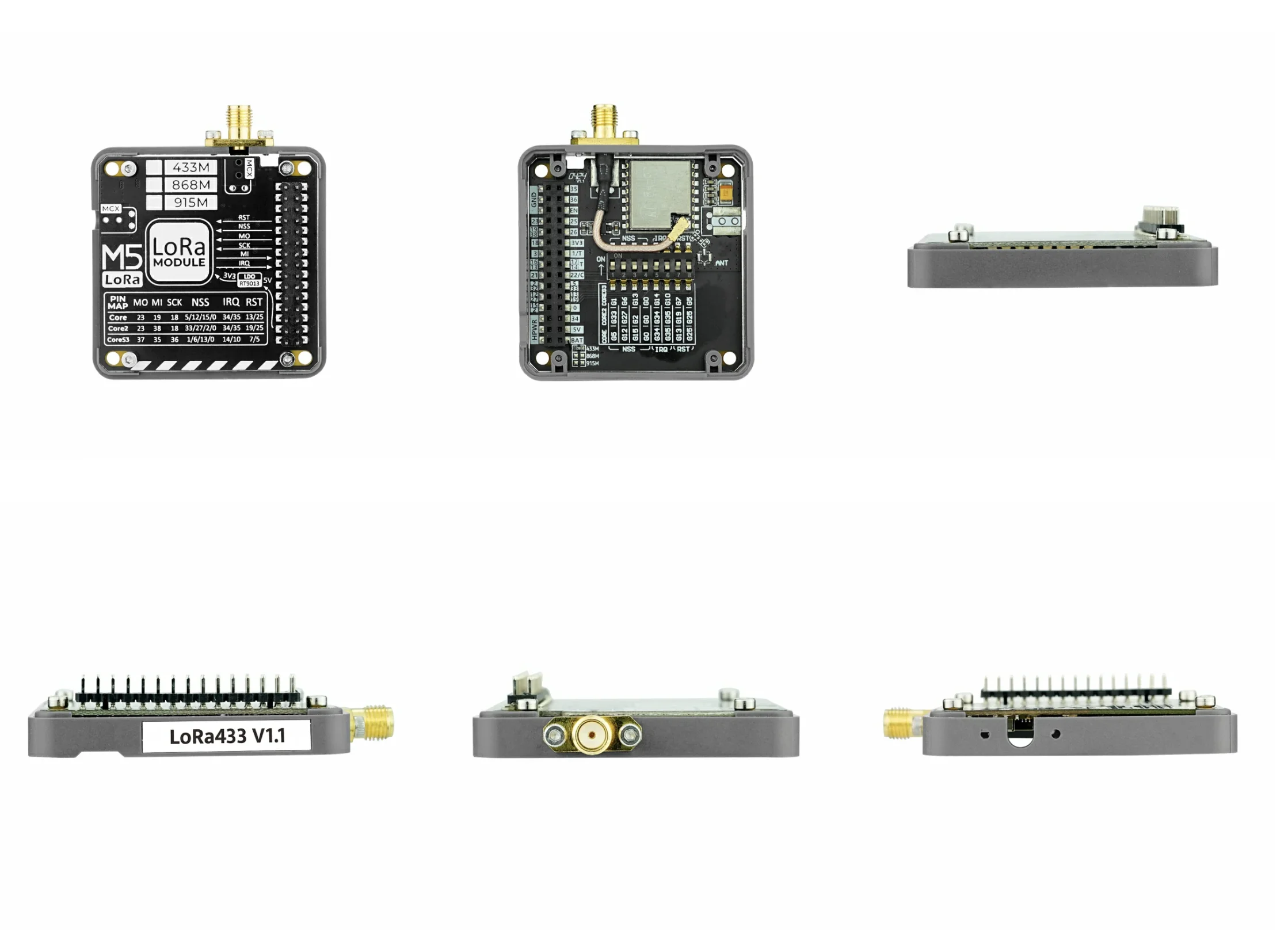 The LoRa433_V1.1 Module is a LoRa communication module within the M5Stack stacking module series, operating at a frequency of 433MHz and utilizing the Ra-02 module (chip SX1278) solution. This module comes standard with an external SMA antenna and also reserves two patch MCX antenna socket interfaces, allowing users to freely switch between different types of antennas according to their needs. Additionally, the module features a DIP switch, enabling users to flexibly switch between different communication pins, allowing for the use of multiple stacks simultaneously, offering more customization possibilities and flexibility. It is suitable for applications in remote monitoring, smart cities, home and industrial automation, and Internet of Things (IoT) devices.