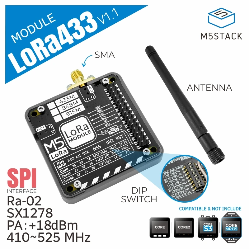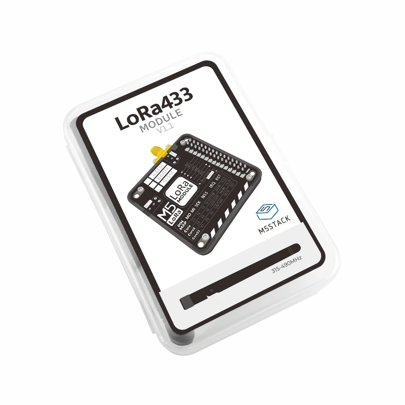 The LoRa433_V1.1 Module is a LoRa communication module within the M5Stack stacking module series, operating at a frequency of 433MHz and utilizing the Ra-02 module (chip SX1278) solution. This module comes standard with an external SMA antenna and also reserves two patch MCX antenna socket interfaces, allowing users to freely switch between different types of antennas according to their needs. Additionally, the module features a DIP switch, enabling users to flexibly switch between different communication pins, allowing for the use of multiple stacks simultaneously, offering more customization possibilities and flexibility. It is suitable for applications in remote monitoring, smart cities, home and industrial automation, and Internet of Things (IoT) devices.