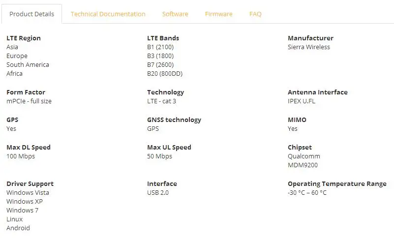 Especificaciones del módulo MC7710 4G LTE:Tecnología de módem: 3G-HSPA, 4G-LTEBandas de frecuencia:LTE: b20 800 / b8 900 / b3 1800 / b1 2100 / b7 2600UMTS/HSPA + 900/2100 MHzGSM/GPRS/EDGE 850/900/1800/1900 MHzMercados anunciados: electrónica de consumoDisponibilidad comercial: no especificadoMontaje: conectado (PCIe, cinta, enchufe)Interfaz eléctrica: Mini tarjeta PCI Express estándar con una interfaz USB 2,0Dimensiones: 51x30x4,5mmPeso: no especificadoRango de temperatura de funcionamiento: -30 ° A + 60 °CModelo de Chipset: Qualcomm MDM9200Comandos de Control: Comandos AT, API GobiQcmb-api: SíProcesador de aplicaciones: NoEntornos de Software compatibles: NingunoSoporte de voz: no especificadoCompatibilidad con SMS: no especificadoCapacidad GPS: asistido y independienteUSB: USB 2,0 de alta velocidadMax GPIOs: 6Interfaz SIM / RUIM: SíCertificaciones del operador: no especificadas