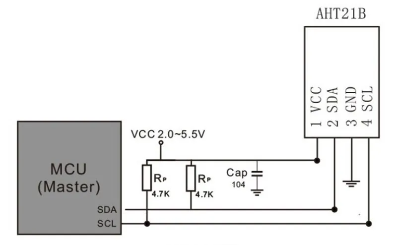 El rango de fuente de alimentación del AHT21B es de 2,0-5,5 V, el voltaje recomendado es de 3,3 V y se debe agregar el condensador de desacoplamiento de 100 NF entre VCC y GND para actuar como un filtro.