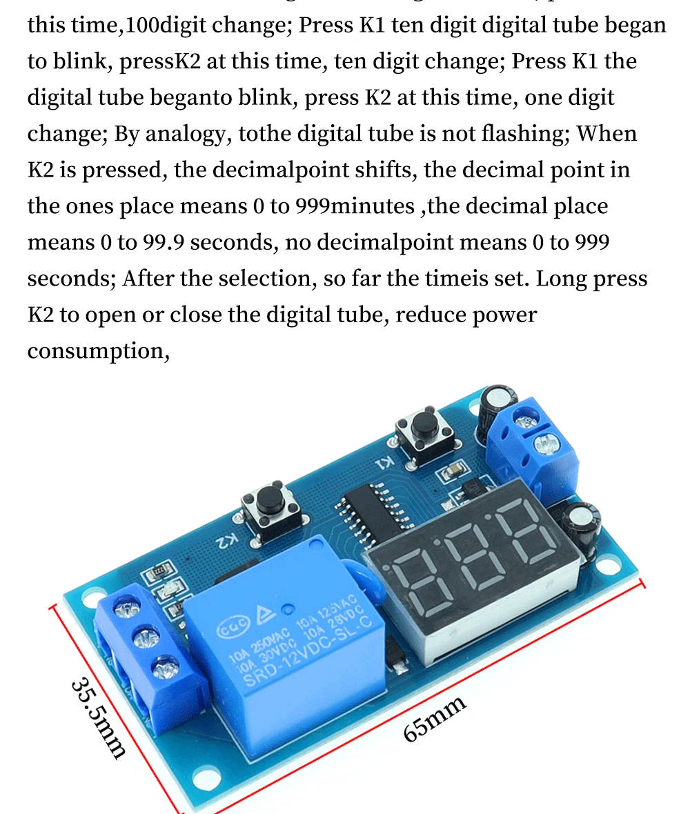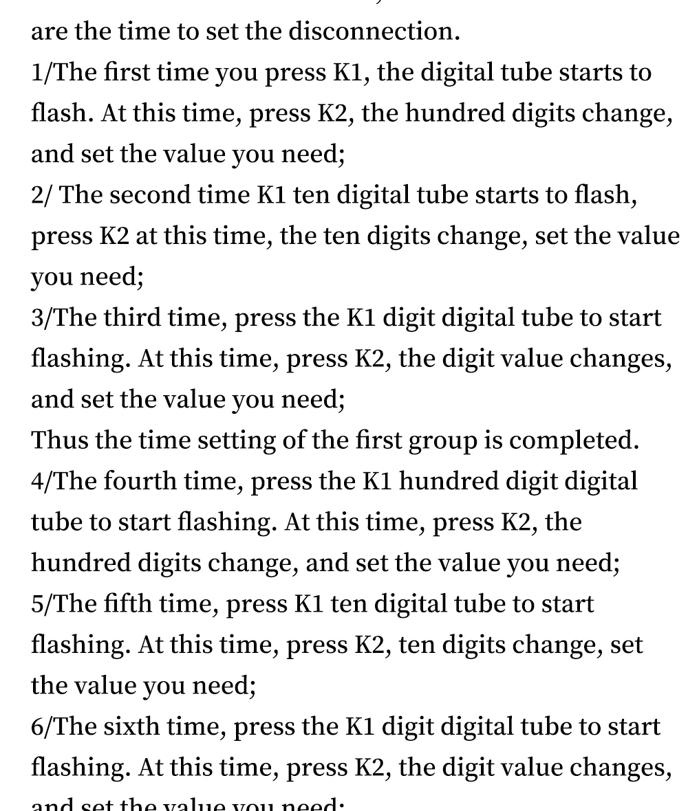 1/La primera vez que presione K1, el tubo digital comenzará a parpadear. En este momento, presione K2, los cien dígitos cambian y establezca el valor que necesita;