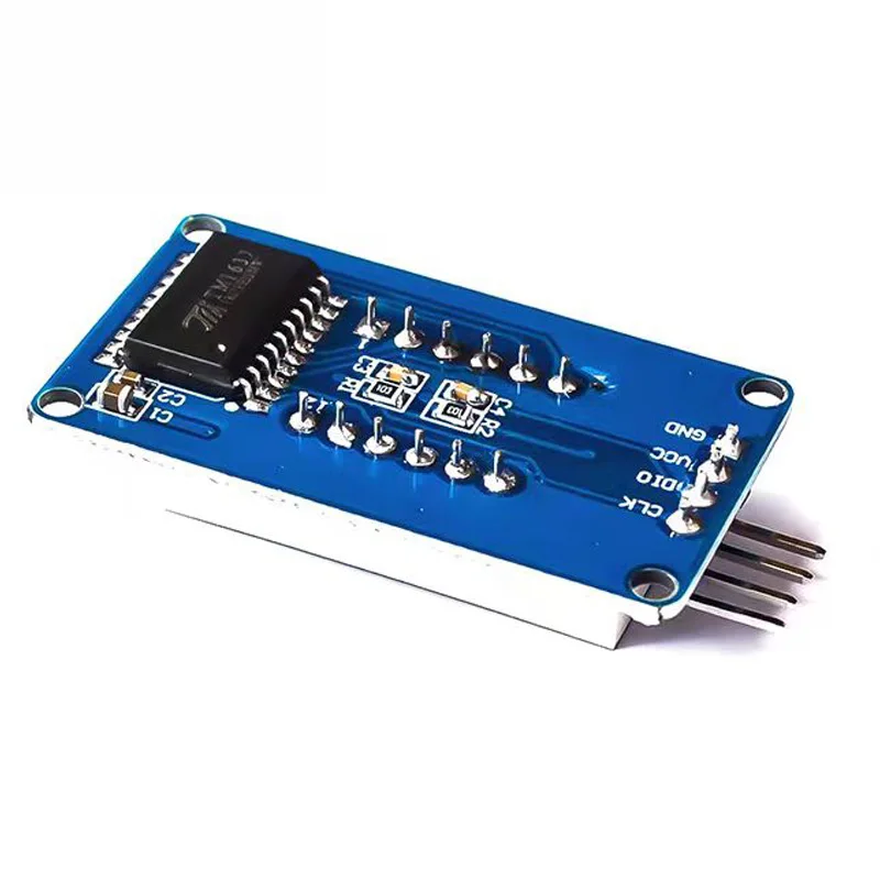 El módulo es un reloj de 12 pies con 4 puntos de controlador de módulo de pantalla digital positivo (0,36 pulgadas) IC TM1637, solo dos líneas de señal pueden hacer SCM cuatro LED de 8 segmentos. Las características del módulo son las siguientes: Visualización del rojo macho para los cuatro tubos digitales. Tubo digital ajustable 8 gris Interfaz de control de nivel para 5V o 3,3V 4 orificios de posicionamiento de tornillos M2 para una fácil instalación 4 módulos de interfaz de pantalla digital como se muestra a continuación: