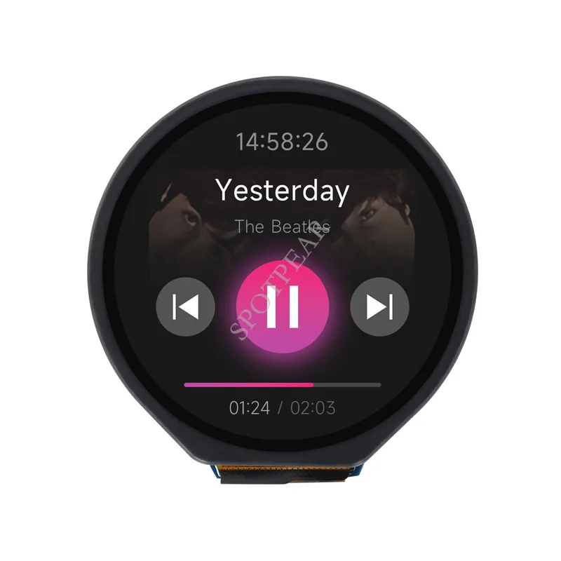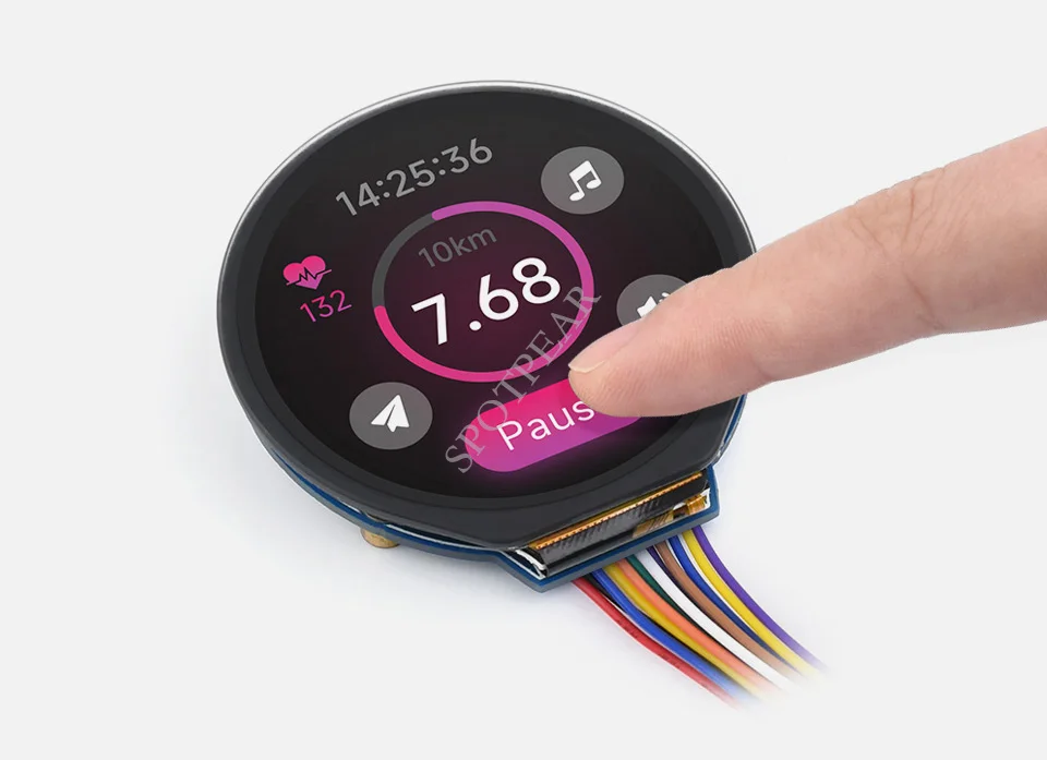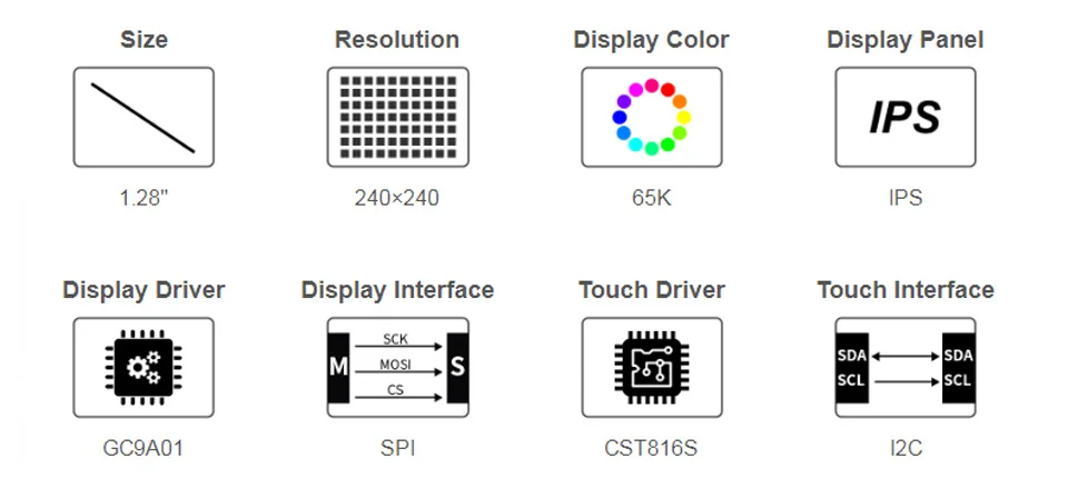 Chip controlador integrado GC9A01 y chip de control táctil capacitivo CST816S, usando comunicación SPI e I2C respectivamente,