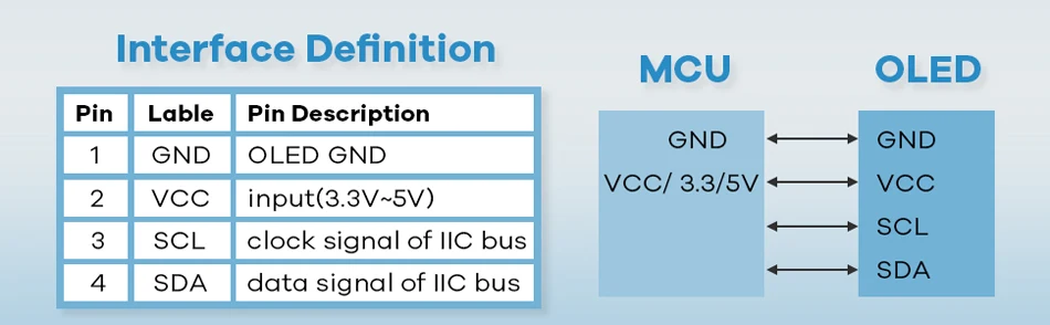 Conductor integrado IC: SSD1306. Comunicación: Interfaz I2C/IIC, solo necesita dos puertos de E/S