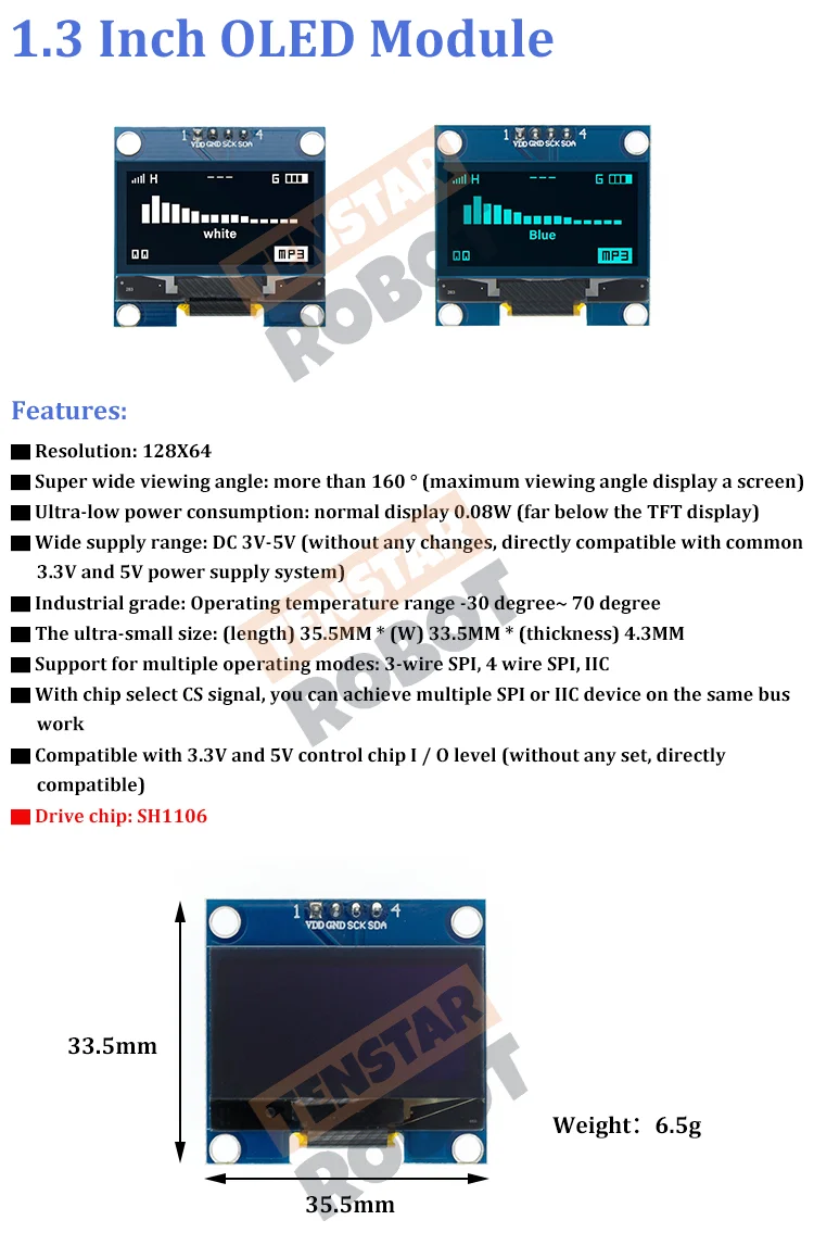 • Pantalla OLED de 1.3 pulgadas :Esta pantalla OLED de 1.3 pulgadas ofrece una resolución de 128x64, proporcionando imágenes claras y nítidas para su proyecto de Arduino.