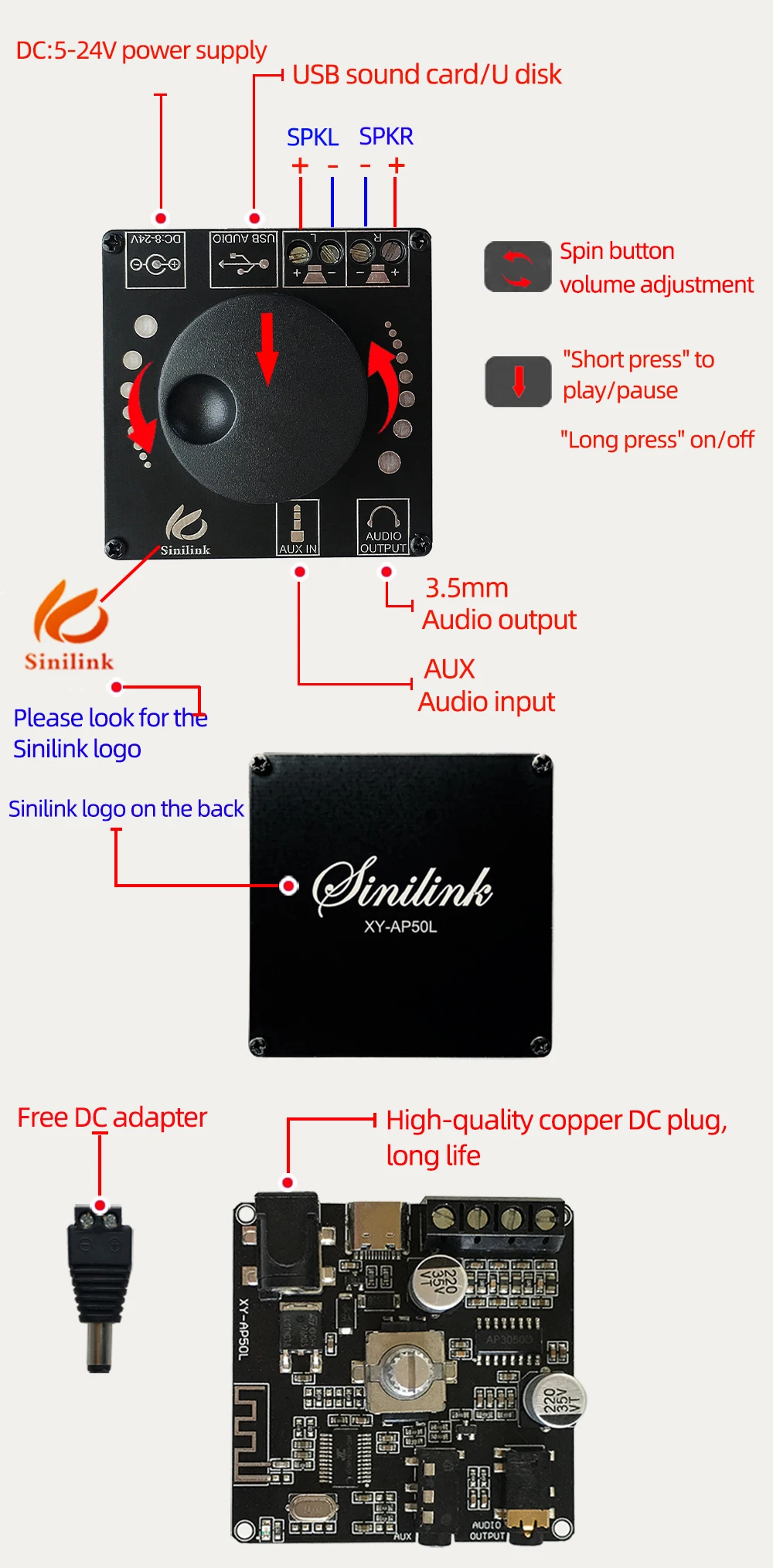 Mini Bluetooth 5,0 50WX2 potencia de Audio inalámbrico Módulo de placa de amplificador estéreo Digital Amp 3,5 MM AUX USB control de volumen XY-AP50L