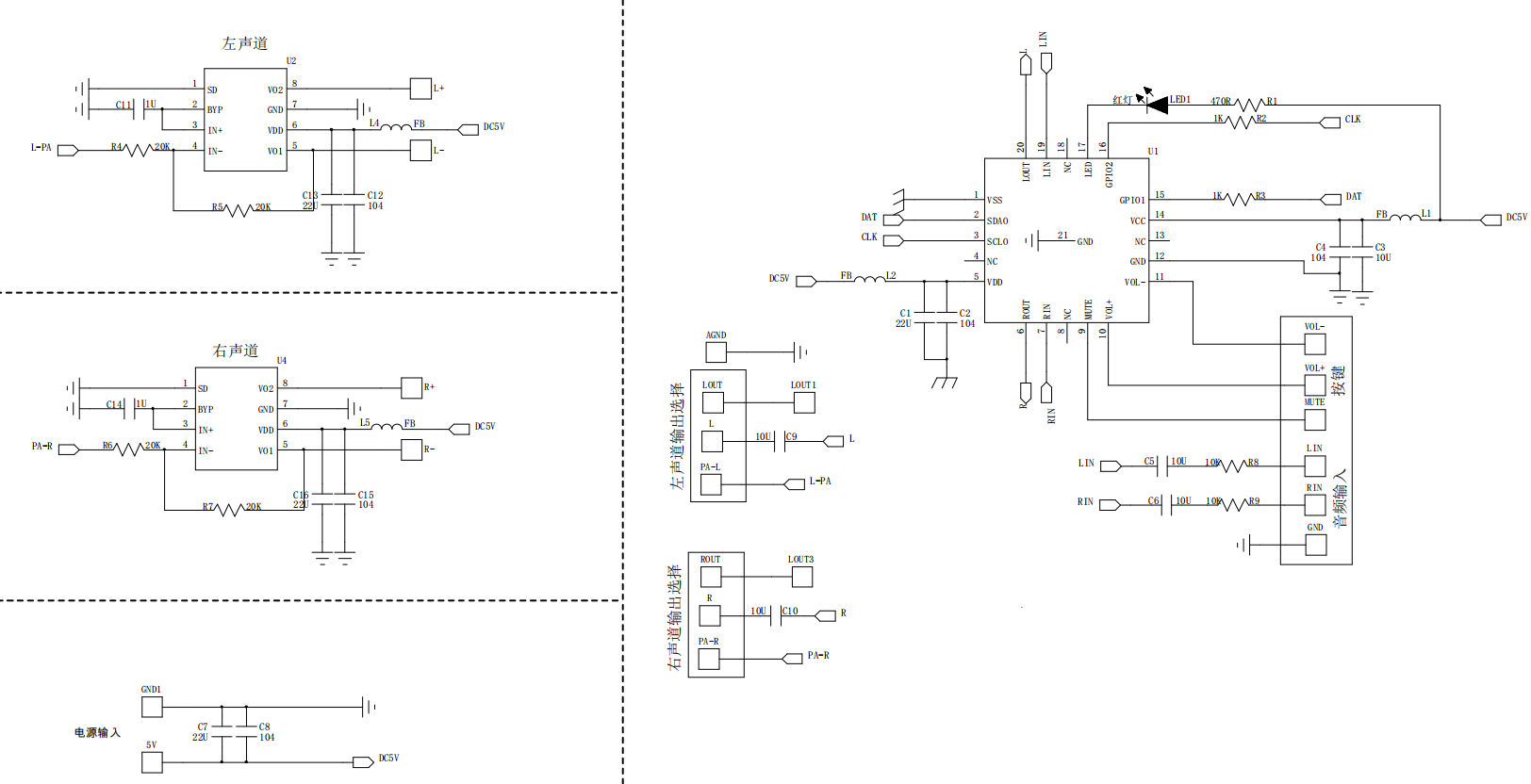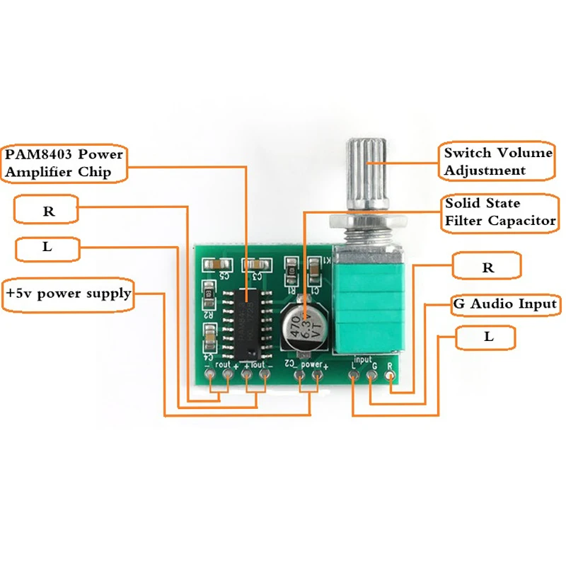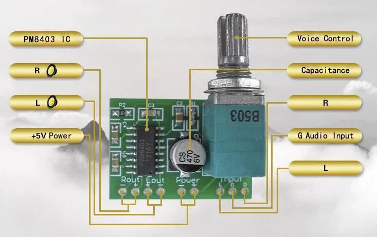1.Chip amplificador de audio PAM8403 integrado, amplificador de audio estéreo sin filtro de clase D de 3W * 22, postes de enlace 2P de paso 5,08 (mm) integrados, respectivamente para salida de cableado de canales izquierdo y derecho3, se ha quitado el pin principal del chip, conveniente para el control del dispositivo externo4, voltaje de trabajo: 5V