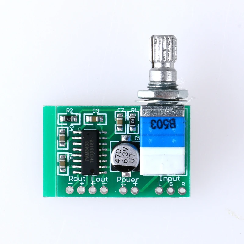 PAM8403Información del producto:PAM8403 es un pequeño chip amplificador digital, la calidad del sonido de alta definición resalta las ventajas de los chips digitales, el circuito utiliza la configuración periférica más razonable, el filtrado de la fuente de alimentación se actualiza a 470 uf (algunos vendedores no tienen menos ni siquiera una capacitancia de 100 uf) 1.Hoja de vidrio de 6 mm, la placa amplificadora real hizo la salida de sonido más detallada y de alta fidelidad de 3 W + 3 W, es un amplificador poco común para entusiastas de los productos, potenciómetro que utiliza el cuerpo anti-metro original, esperanza de vida de hasta 15 años, potenciómetro con interruptor puede Corte la fuente de alimentación directamente en sentido antihorario. ¡El comprador ha recibido el listado!Característica:Rango de potencia: CC 2,5 V – 5,5 VSalida mínima: 3W * 2Dimensiones: 29,5 * 20,2 * 15 mmNota:asegúrese de que la fuente de alimentación no supere los 5,5 V y no invierta la polaridad para "+" y "-", de lo contrario, quemará la placa.