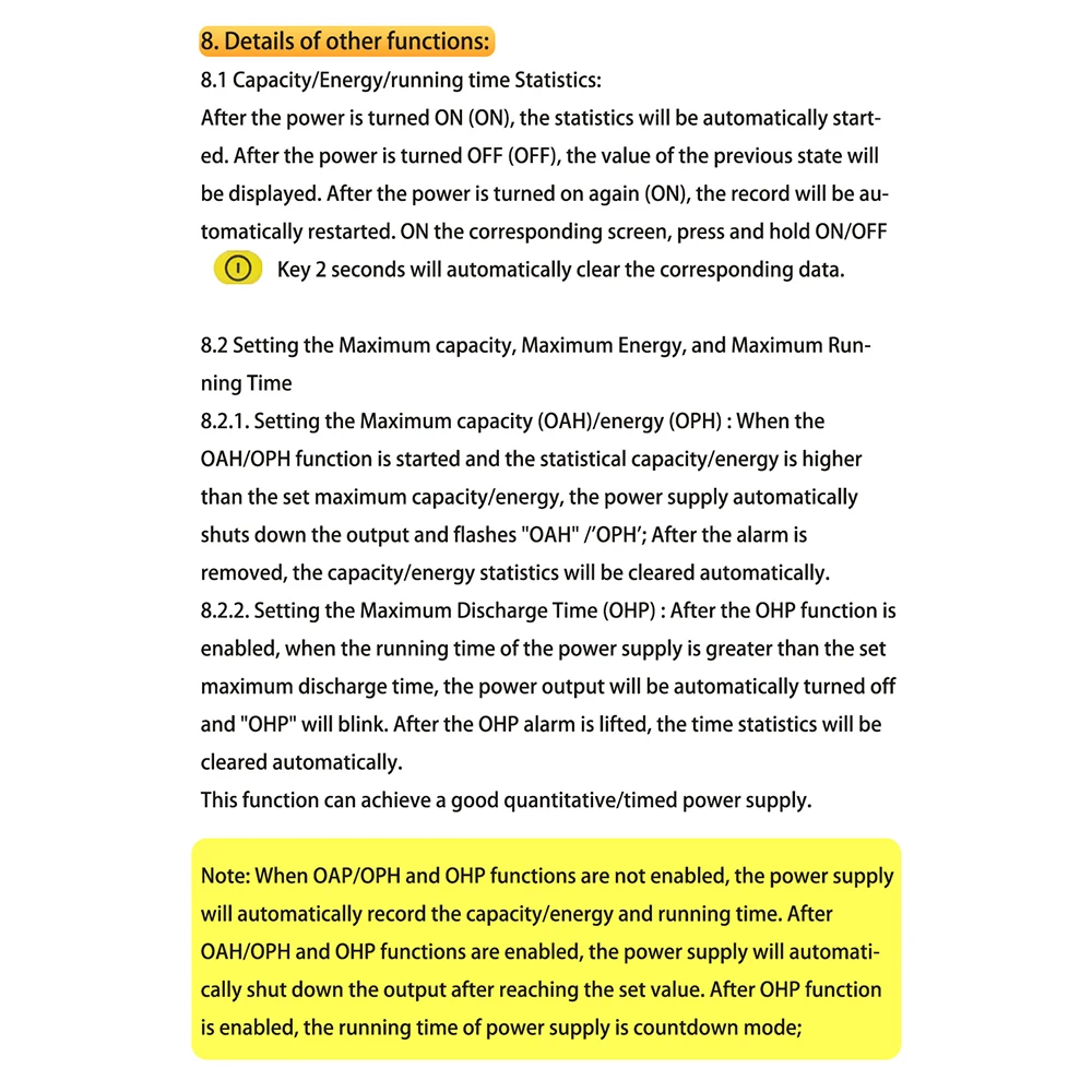 Protección de súper energía: 0~9999WH, ajustable y cerrado por defecto