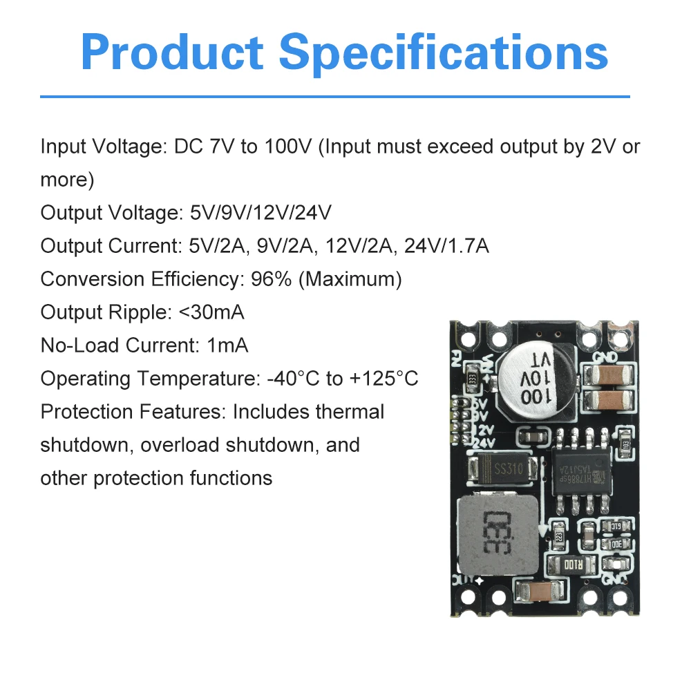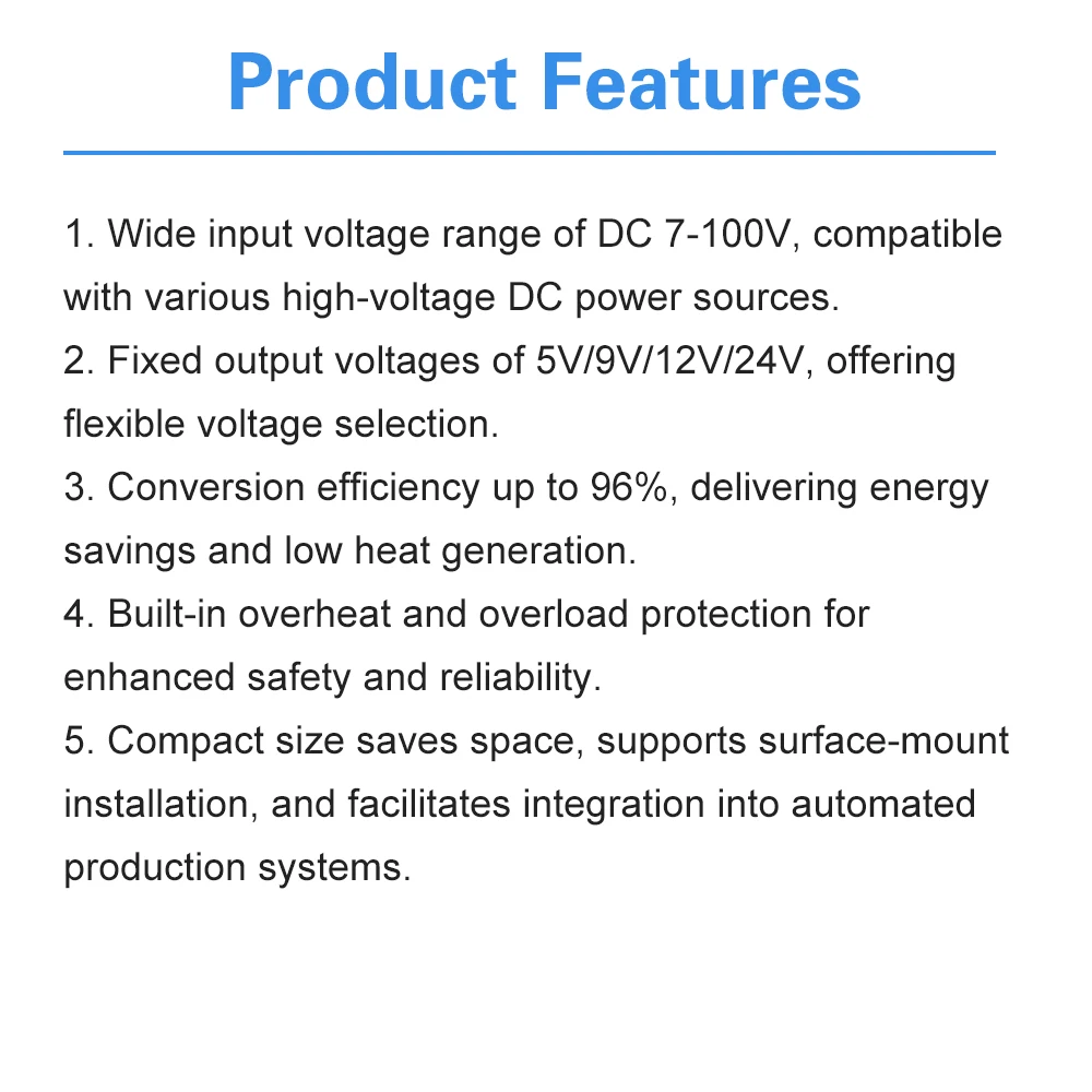 1.Amplio voltaje de entrada DC7-100V, compatible con varias fuentes de alimentación CC de alto voltaje.
