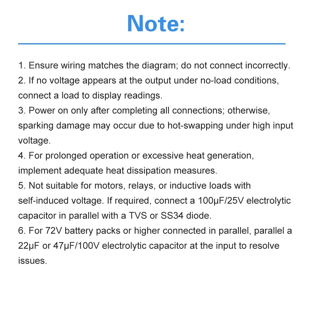 5.No apto para motores, relés, cargas inductivas con voltaje autoinderado, que requieren la capacidad de generar condensadores electrolíticos paralelos de 100 UF/25 V con TVS o diodo SS34.