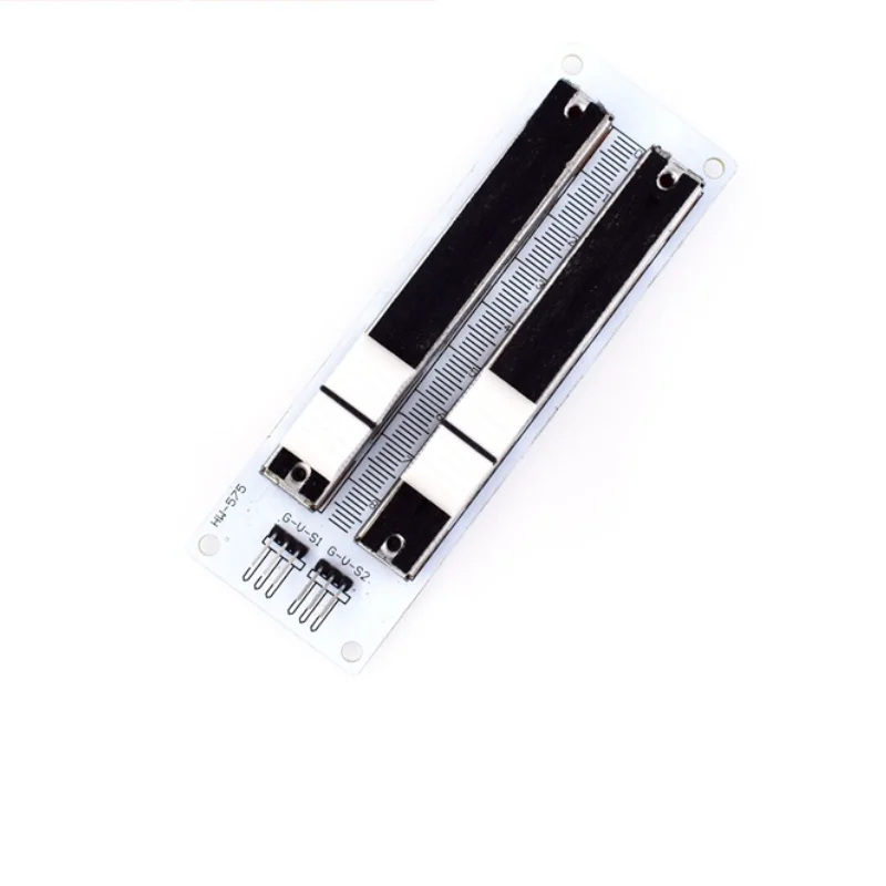 Bloque de construcción electrónico 10K Módulo de potenciómetro lineal deslizante de doble fila para mezclador Arduino Resistencia deslizante lineal Instrucciones de cableado: Conéctese al controlador principal de acuerdo con la etiqueta de interfaz estándar del módulo sensor.La etiqueta "G" está conectada a la "tierra" del controlador principal, "V" está conectada a "5V" y "S" está conectada a los pines A0 y A1 de "Arduino".Grabe el programa de prueba.