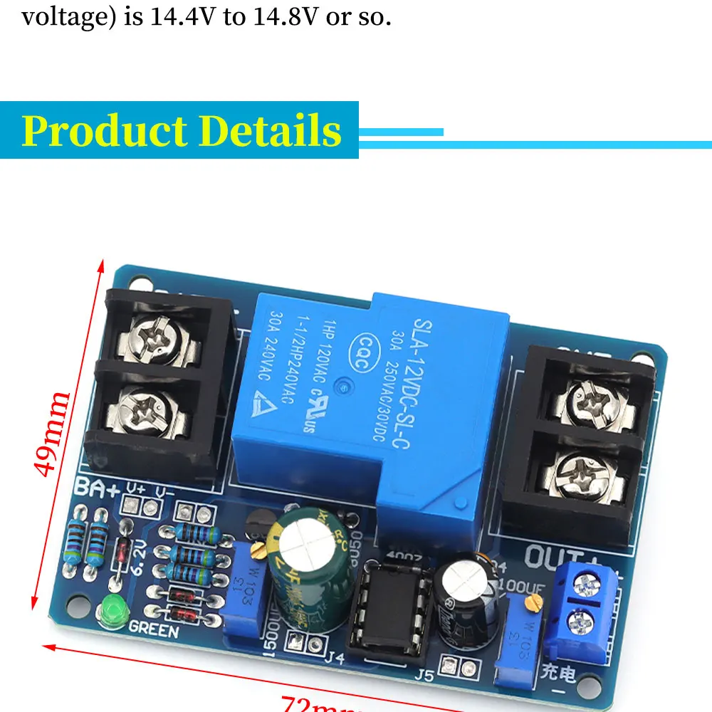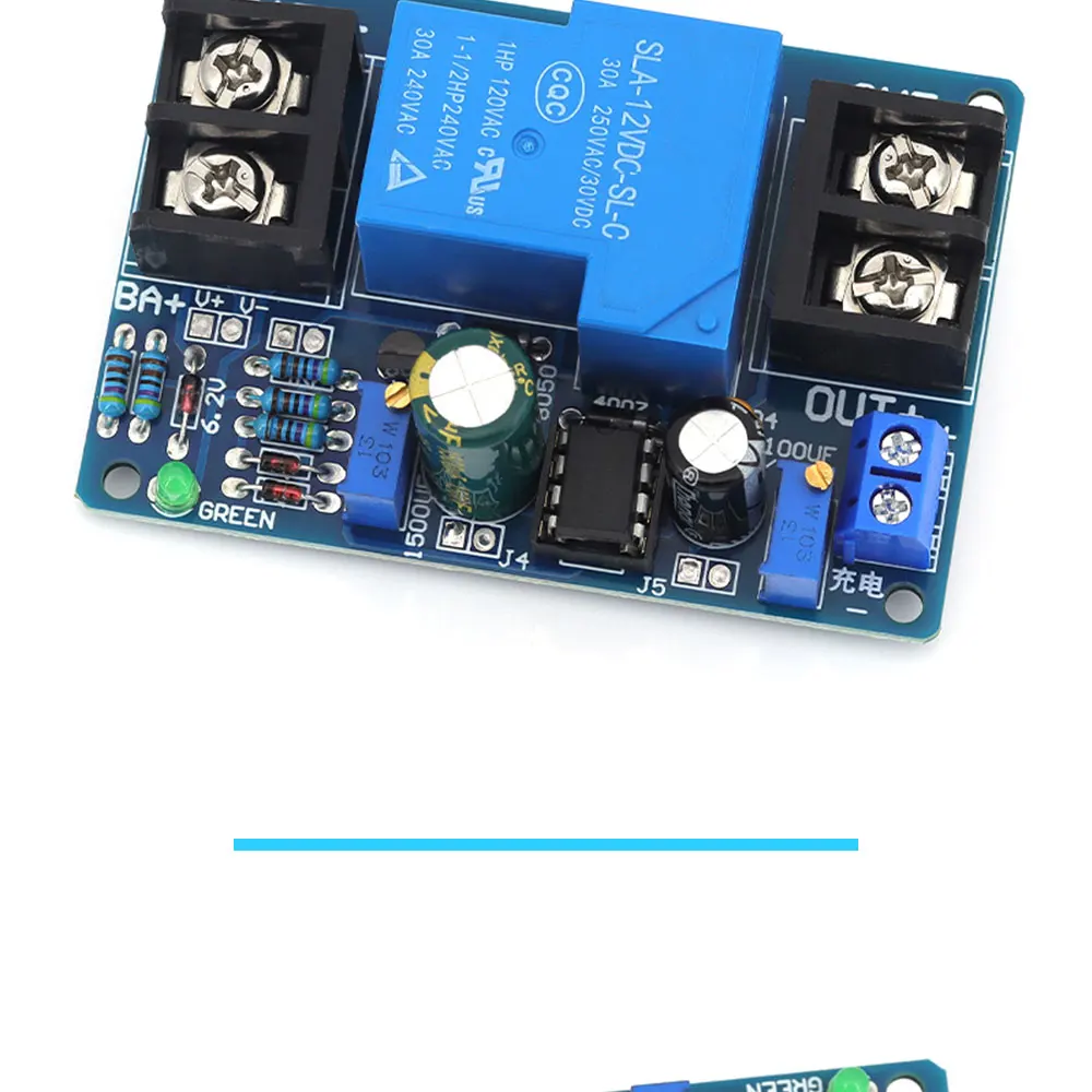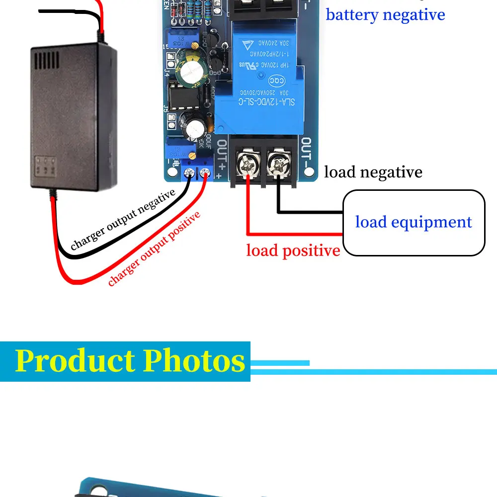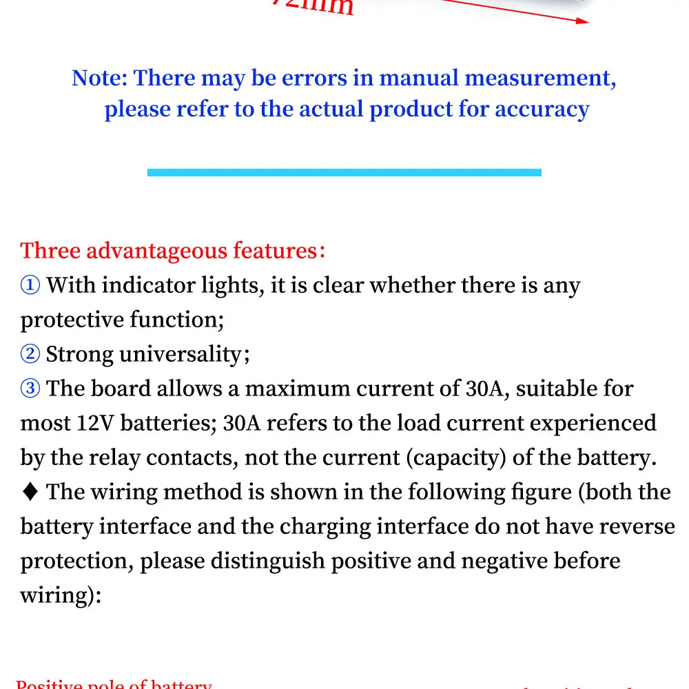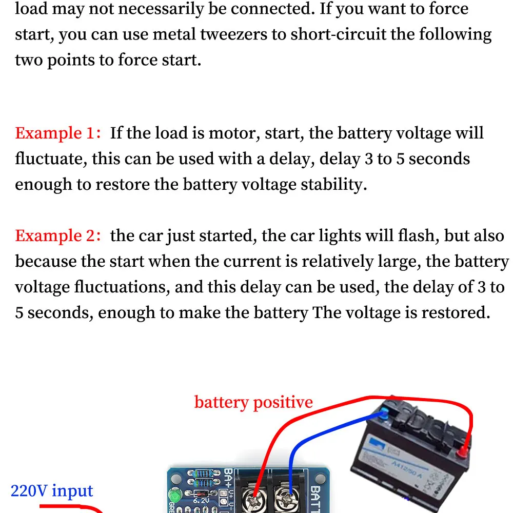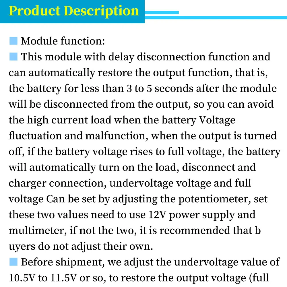 Este módulo con función de desconexión de retardo y puede restaurar automáticamente la función de salida, es decir, la batería durante menos de 3 a 5 segundos después de que el módulo se desconectará de la salida, por lo que puede evitar la carga de alta corriente cuando la batería fluctúa el voltaje y mal funcionamiento, cuando la salida está apagada, si el voltaje de la batería sube al máximo voltaje, la batería encenderá automáticamente la carga, desconectará y la conexión del cargador, dos voltaje de subtensión y el voltaje total, se