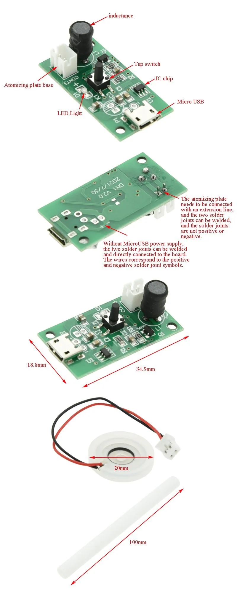 3. El diámetro neto de la lámina atomizadora de acero laminado es de 16mm, el diámetro exterior del anillo de silicona es de 20mm y la longitud del cable es de 75mm. (Cable rojo positivo, cable negro negativo)